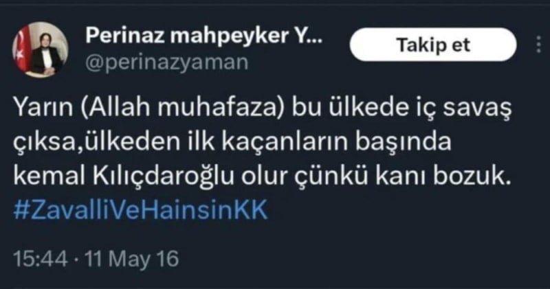 Yaman'ın, geçtiğimiz yıllarda Kılıçdaroğlu'nu hedef alan bir paylaşımında, 'zavallı, hain ve kanı bozuk' ifadelerini kullandığı görüldü.