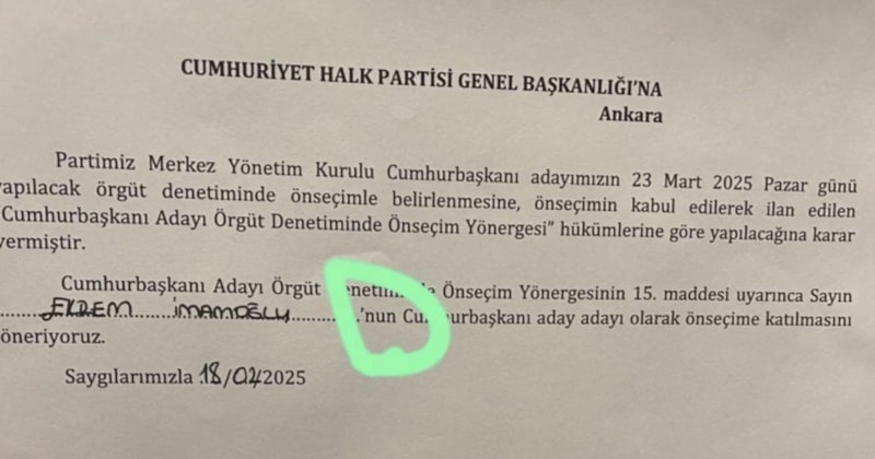 Öte yandan CHP TBMM Grubu'nda ön seçim için hazırlanan, cumhurbaşkanlığı aday adaylığına yönelik öneri formu dikkati çekmişti.