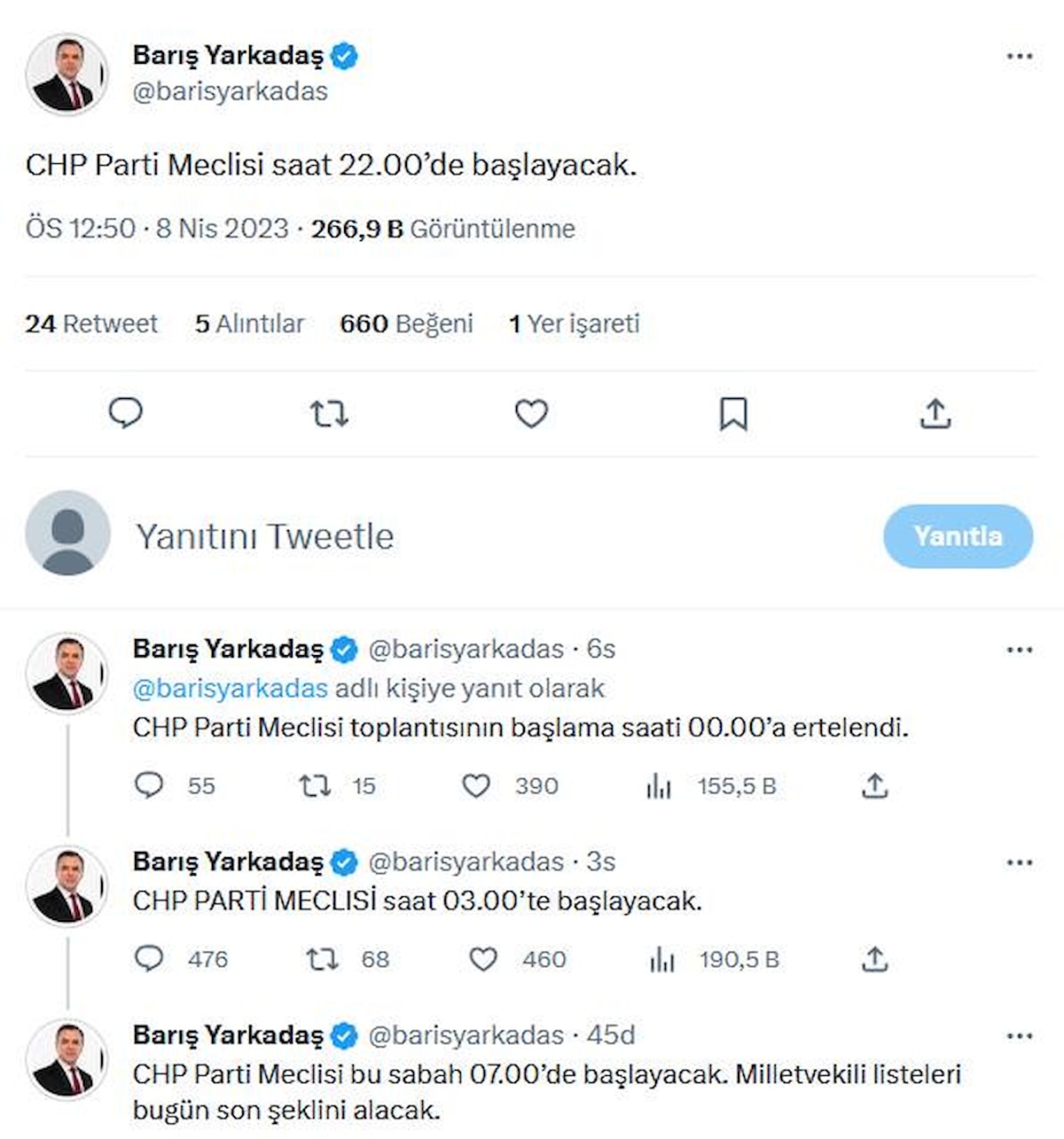 Gelişmeleri Twitter hesabından bildiren CHP eski Milletvekili Barış Yarkadaş, şu paylaşımları yaptı: