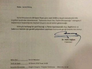 CHP ilçe başkanlıklarına gönderilen yazıda, "Mitingde herhangi bir parti bayrağı ve flama taşınmayacak olup; örgütümüz ve halkımızın katılımı için gerekli çalışmaların yapılması huhusunda gereği önemle rica olunur." ifadelerine yer verildi.