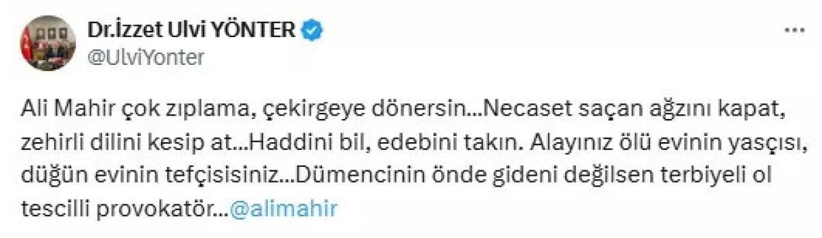 MHP Genel Başkan Yardımcısı İzzet Ulvi Yönter sosyal medya hesabından yaptığı açıklamada, "Ali Mahir çok zıplama, çekirgeye dönersin…Necaset saçan ağzını kapat, zehirli dilini kesip at…Haddini bil, edebini takın. Alayınız ölü evinin yasçısı, düğün evinin tefçisisiniz…Dümencinin önde gideni değilsen terbiyeli ol tescilli provokatör…" ifadelerini kullandı.
