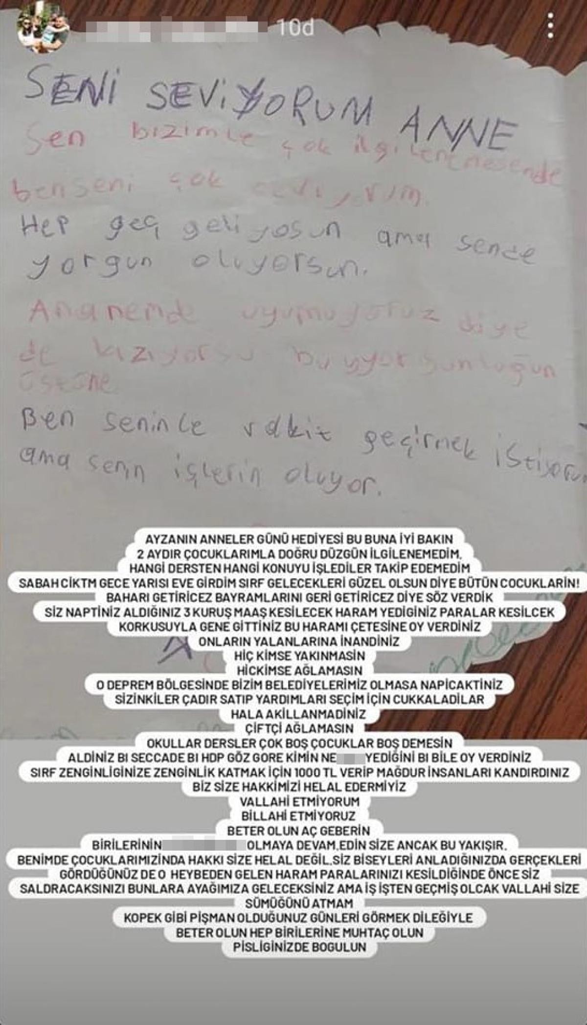 Ayza'nın Anneler Günü hediyesi bu. Buna iyi bakın 2 aydır çocuklarıma doğru düzgün ilgilenemedim. Hangi dersten hangi konuyu işlediler takip edemedim. Sabah çıktım gece yarısı eve girdim sırf gelecekleri güzel olsun diye bütün çocukların. Baharı getireceğiz bayramlarını geri getireceğiz diye söz verdik. Siz ne yaptınız? Aldığınız 3 kuruş maaş kesilecek, haram yediğiniz paralar kesilecek korkusuyla yine gittiniz bu haram çetesine oy verdiniz. Onların yalanlarına inandınız. Hiç kimse yakınmasın, hiç kimse ağlamasın. O deprem bölgesinde bizim belediyelerimiz olmasa ne yapacaktınız? Sizinkiler çadır satıp yardımları seçim için cukkaladılar. Hala akıllanmadınız. Çiftçi ağlamasın, okullar dersler boş, çocuklar boş demesin.