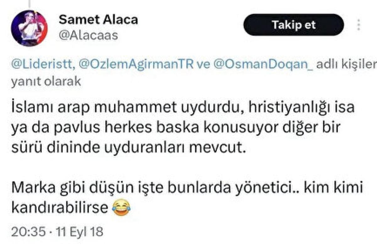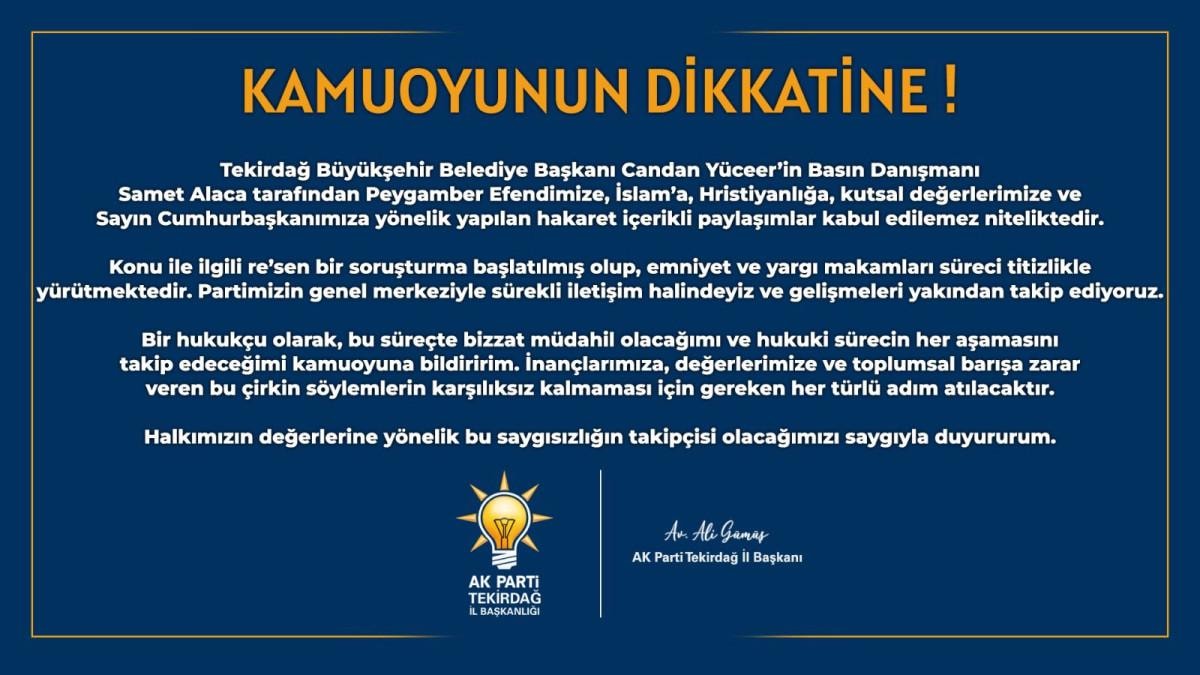 Tekirdağ Büyükşehir Belediye Başkanı Candan Yüceer'in Basın Danışmanı Samet Alaca tarafından Peygamber Efendimize, İslam'a, Hristiyanlığa, kutsal değerlerimize ve Sayın Cumhurbaşkanımıza yönelik yapılan hakaret içerikli paylaşımlar kabul edilemez niteliktedir.