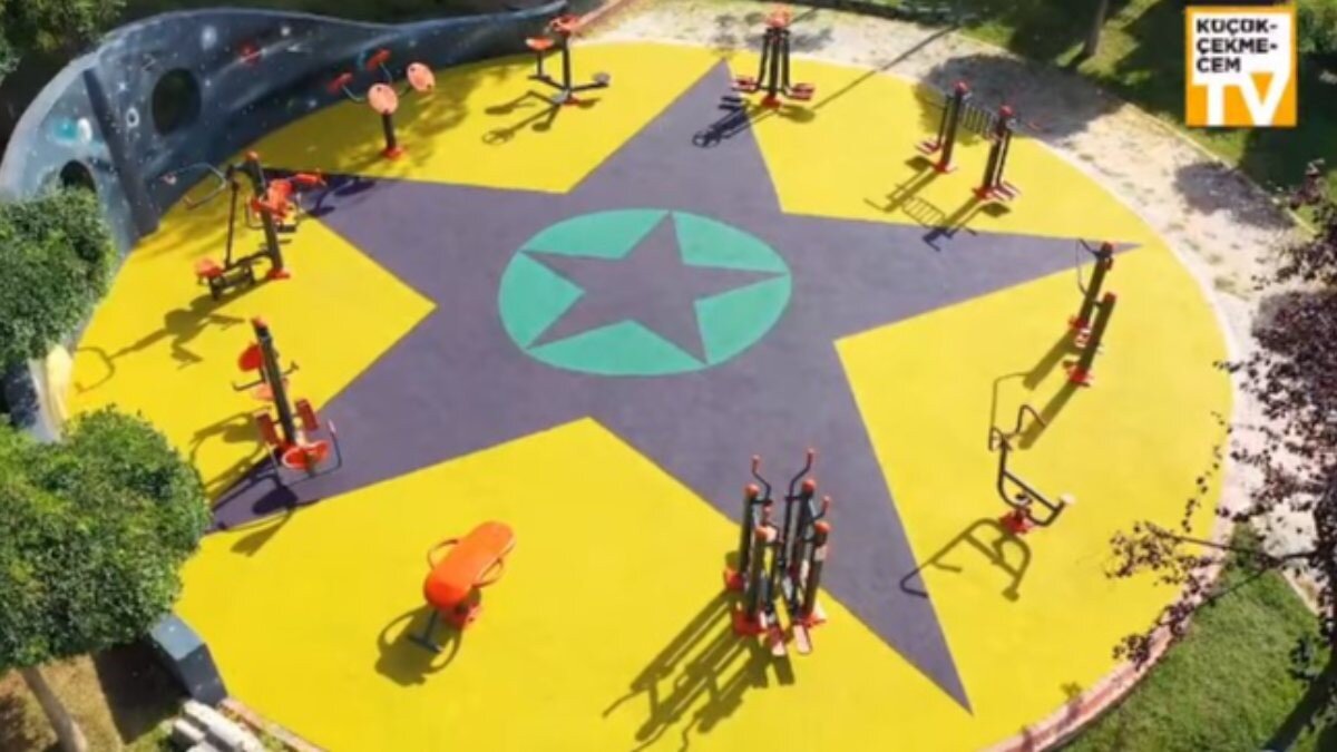 Çocuklar için yapılan park hizmete açılırken, kullanılan renkler ve spor malzemelerinin bulunduğu alandaki görsel dikkat çekti.