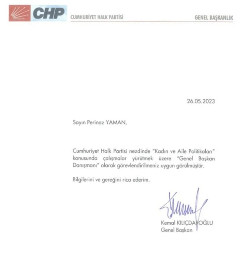 CHP Lideri'nin ıslak imzası ile 'Kadın ve Aile Politikaları' konusunda çalışmalar yürütmek üzere Genel Başkan Danışmanı' olarak Perinaz Mahpeyker Yaman atandı.