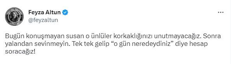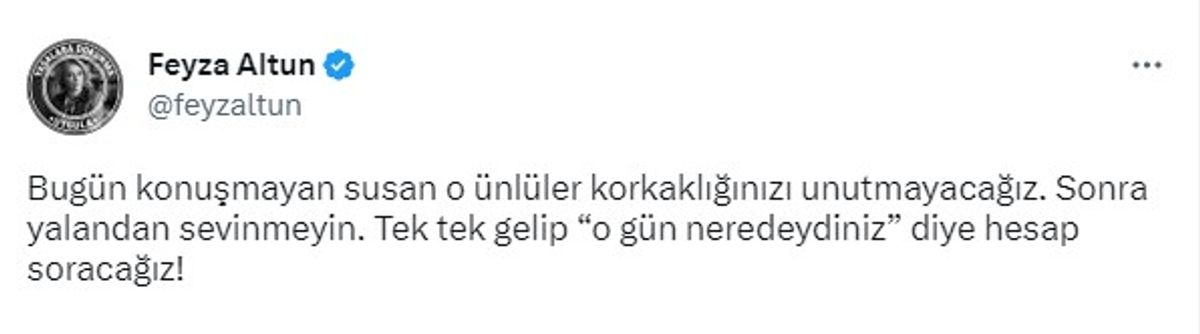 Bugün konuşmayan susan o ünlüler korkaklığınızı unutmayacağız. Sonra yalandan sevinmeyin. Tek tek gelip “o gün neredeydiniz” diye hesap soracağız!