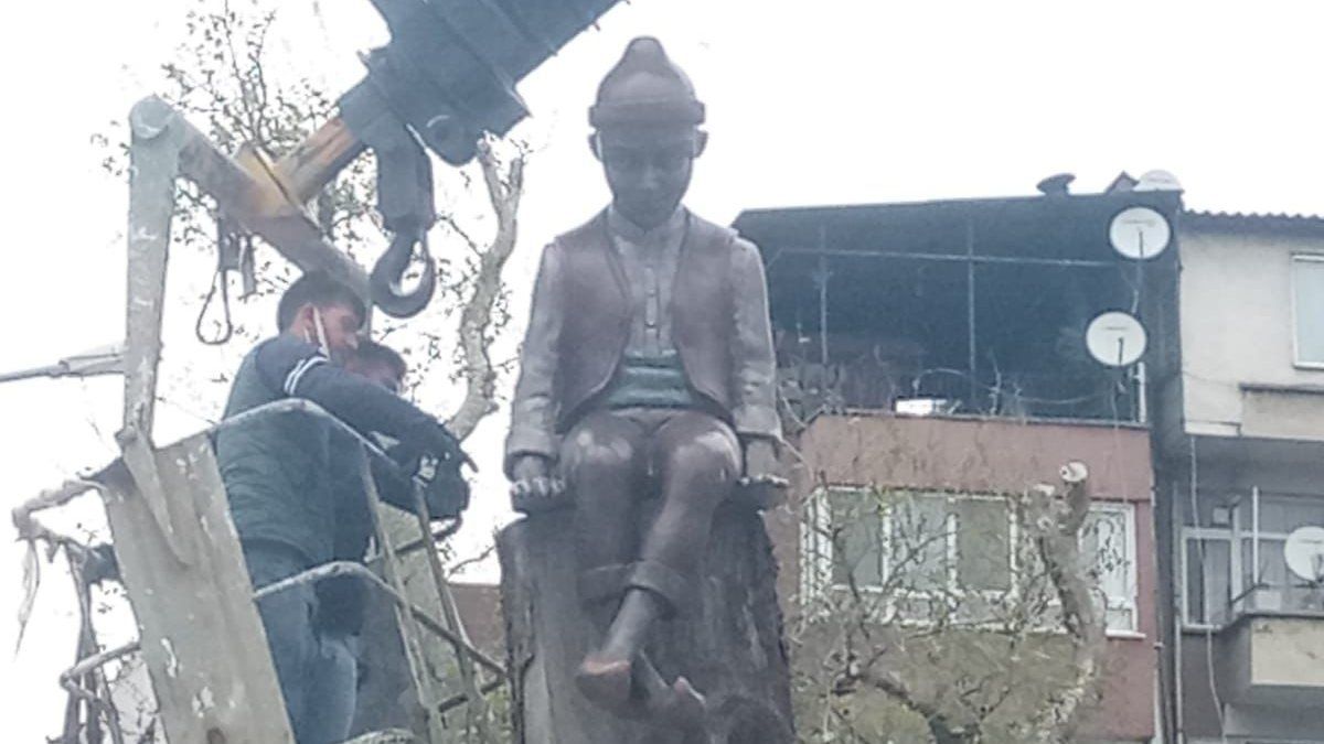 Gemlik’te belediye ekipleri işe koyuldu, Tankut Öktem heykel atölyesinde yaptırılan Keloğlan heykelini, otobüs duraklarının bulunduğu alana getirdi.