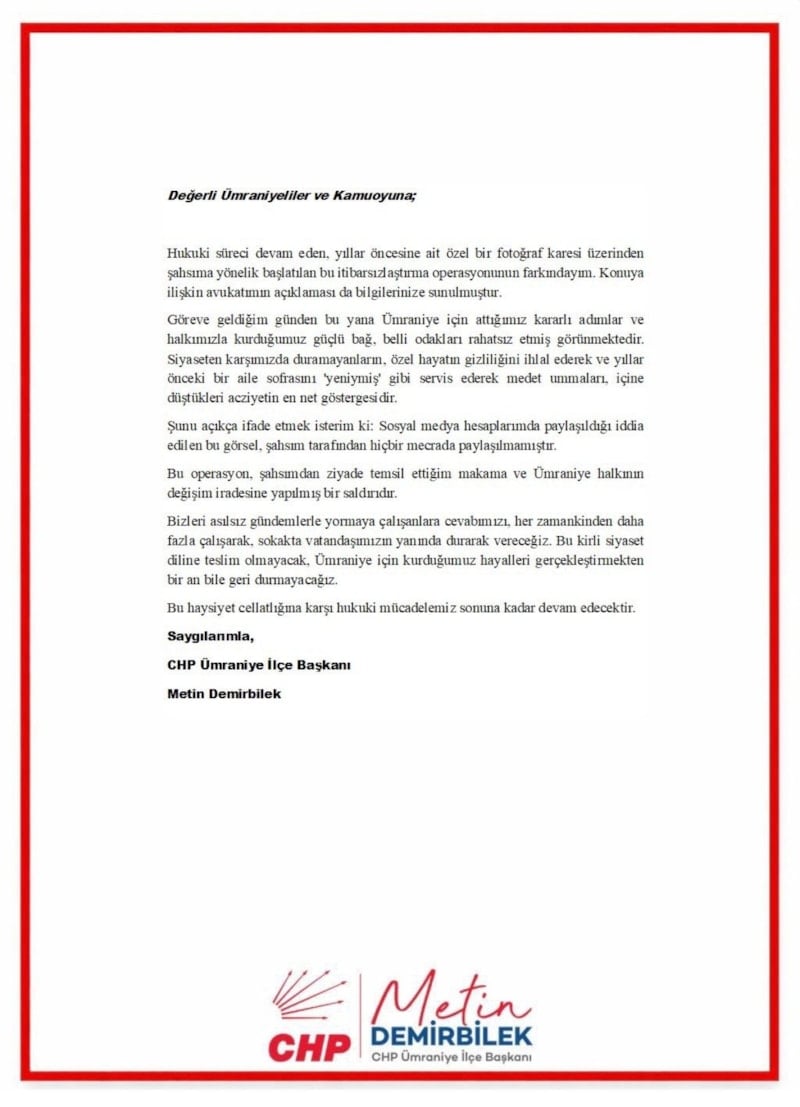 Cumhuriyet Halk Partisi'nin Ümraniye İlçe Başkanı Metin Demirbilek'in sosyal medya hesabından yaptığı bir paylaşım olay oldu.