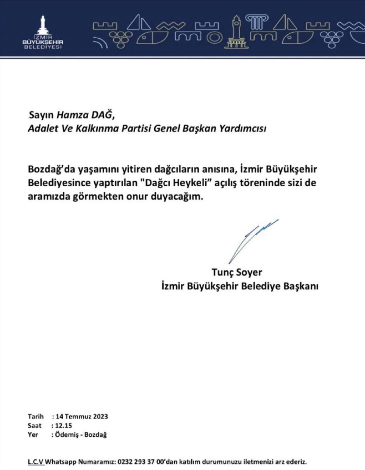 İzmir Büyükşehir Belediyesi Başkanı Tunç Soyer imzalı davette, AK Parti Genel Başkan Yardımcısı Hamza Dağ'a heykelin açılışı için yazı gönderildi.