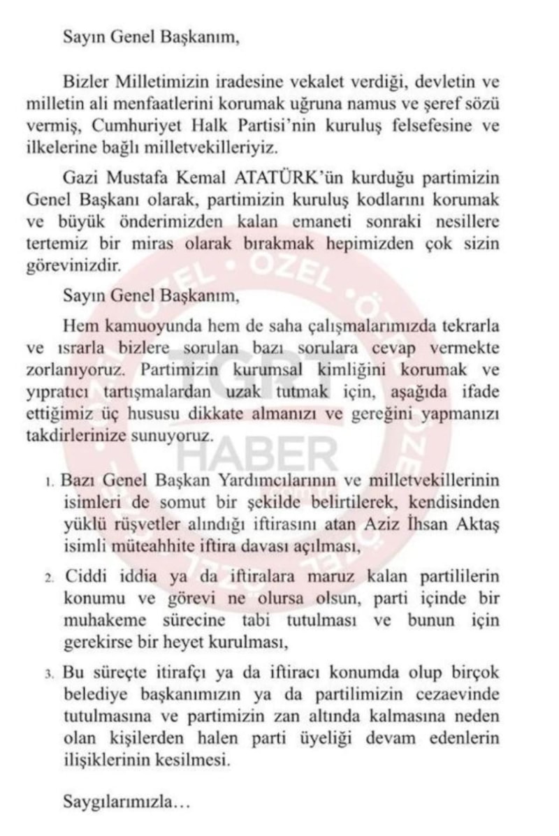 Kendilerini CHP’nin kuruluş felsefesine ve Atatürk ilkelerine bağlı milletvekilleri olarak tanımlayan imzacılar, Özel’den parti içinde kapsamlı bir arınma süreci başlatmasını talep etti.