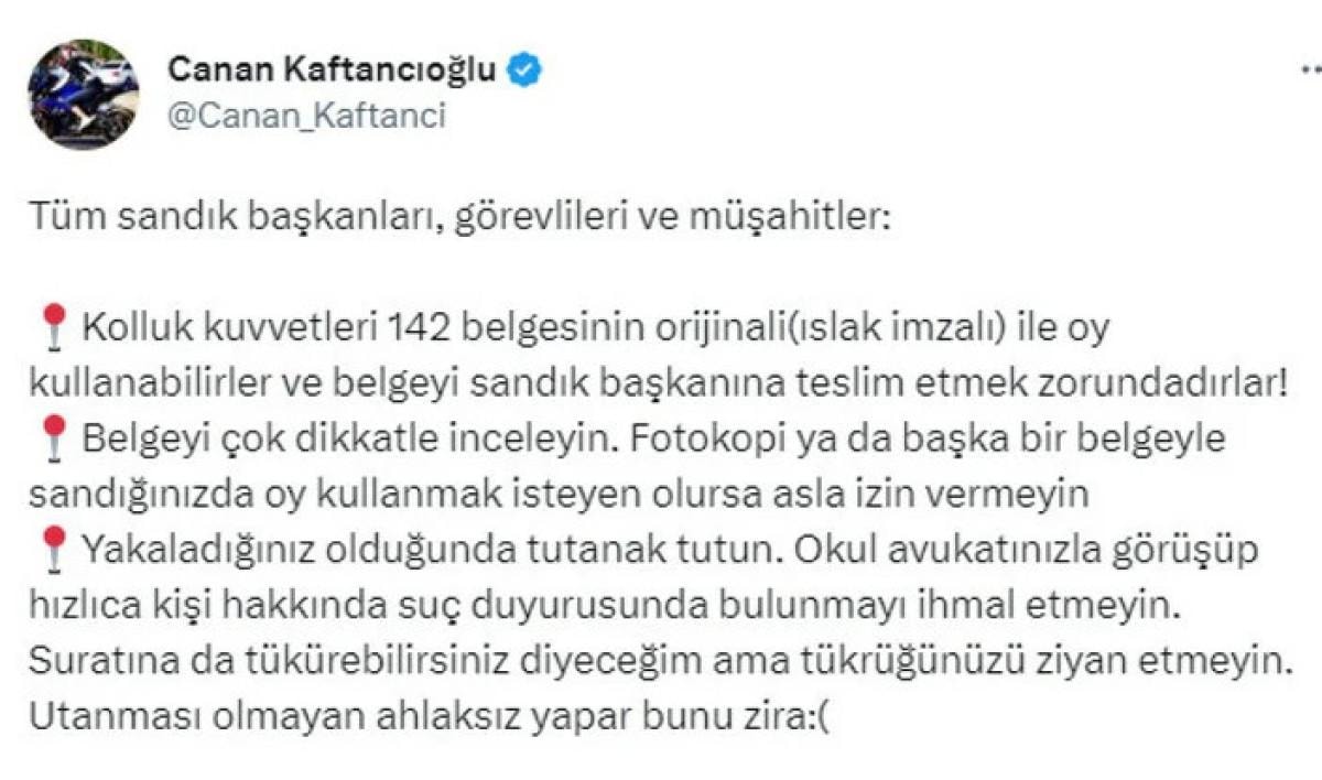 Kaftancıoğlu, paylaşımında 142 nolu belgeyle oy kullanmak isteyen polislerin sadece orijinal belgeleyle oy kullanabileceğini, fotokopi veya başka belgeyle oy kullanmak isteyen polislere izin verilmemesini ve bunların yüzüne tükürülmesini istedi.