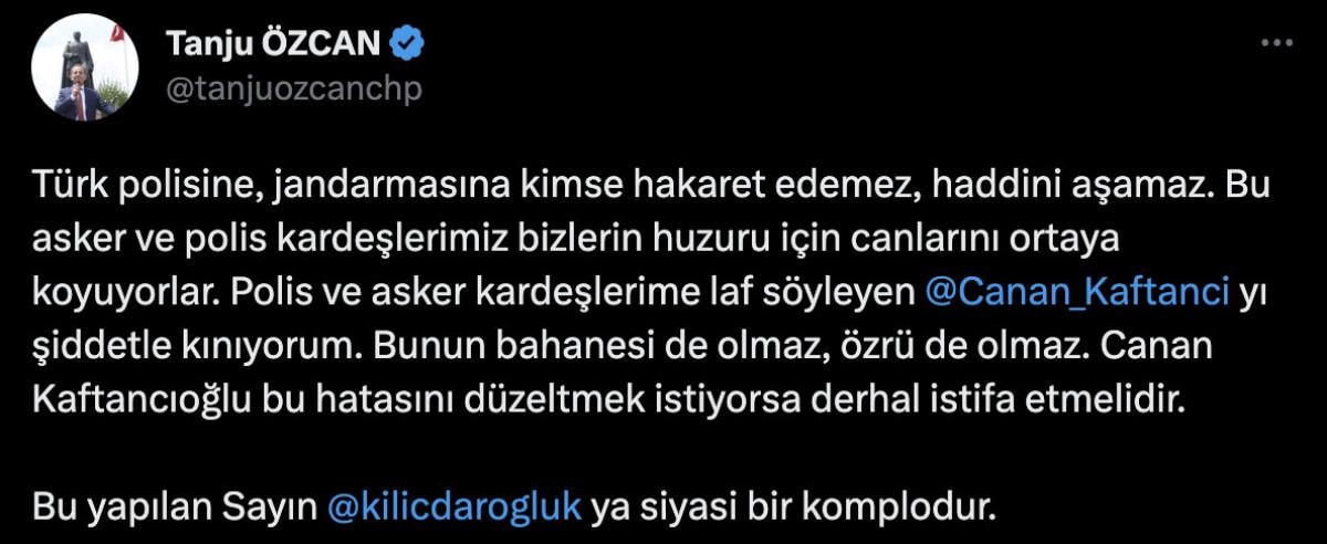 Canan Kaftancıoğlu'na sert bir şekilde tepki gösteren CHP'li Bolu Belediye Başkanı Tanju Özcan, "Türk polisine, jandarmasına kimse hakaret edemez, haddini aşamaz. Bu asker ve polis kardeşlerimiz bizlerin huzuru için canlarını ortaya koyuyorlar. Polis ve asker kardeşlerime laf söyleyen Canan Kaftancıoğlu'nu şiddetle kınıyorum. Bunun bahanesi de olmaz, özrü de olmaz. Canan Kaftancıoğlu bu hatasını düzeltmek istiyorsa derhal istifa etmelidir. Bu yapılan Sayın Kemal Kılıçdaroğlu'na siyasi bir komplodur" paylaşımında bulundu.