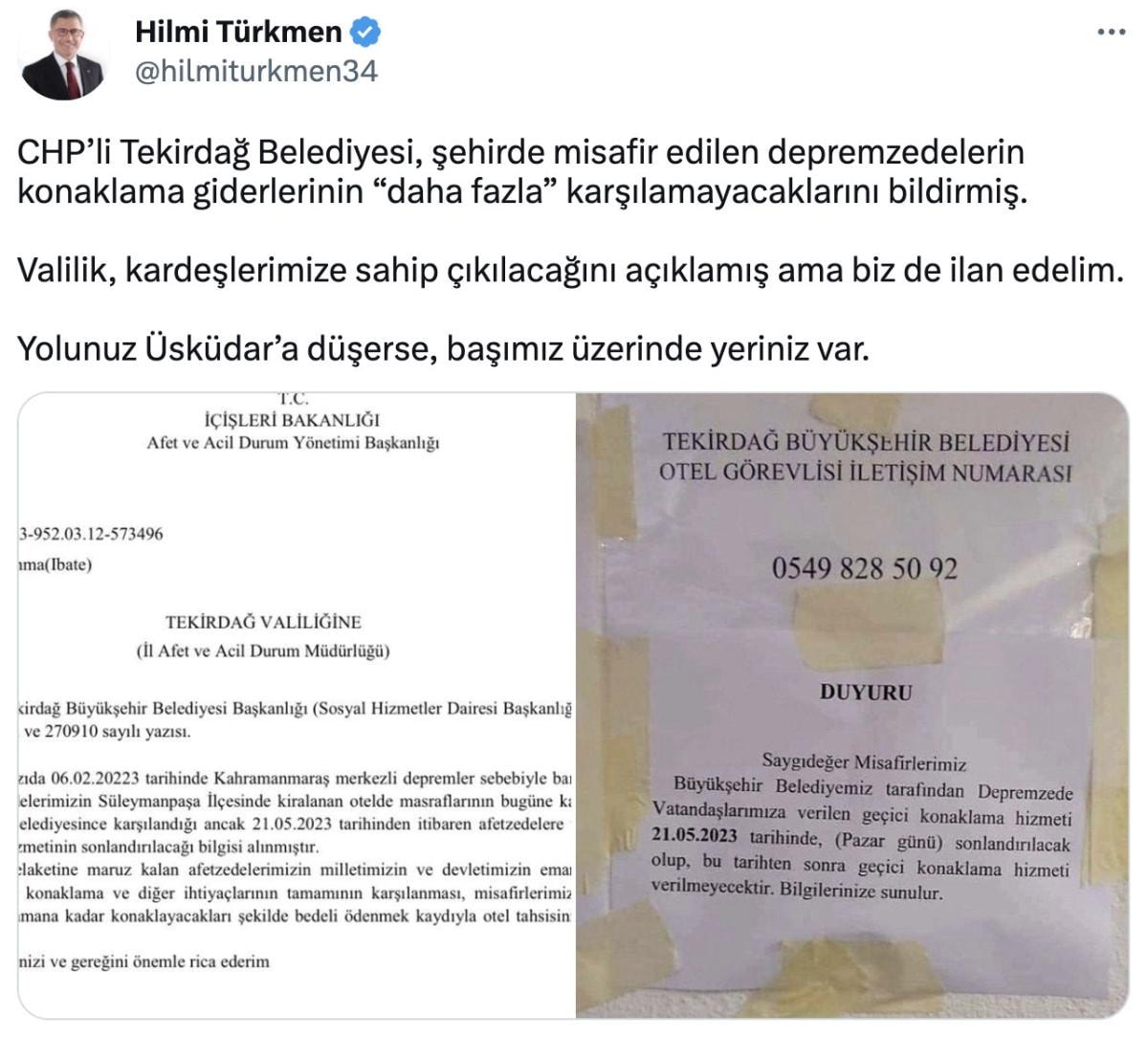 CHP’li Tekirdağ Belediyesi, şehirde misafir edilen depremzedelerin konaklama giderlerinin “daha fazla” karşılamayacaklarını bildirmiş. Valilik, kardeşlerimize sahip çıkılacağını açıklamış ama biz de ilan edelim. Yolunuz Üsküdar’a düşerse, başımız üzerinde yeriniz var.