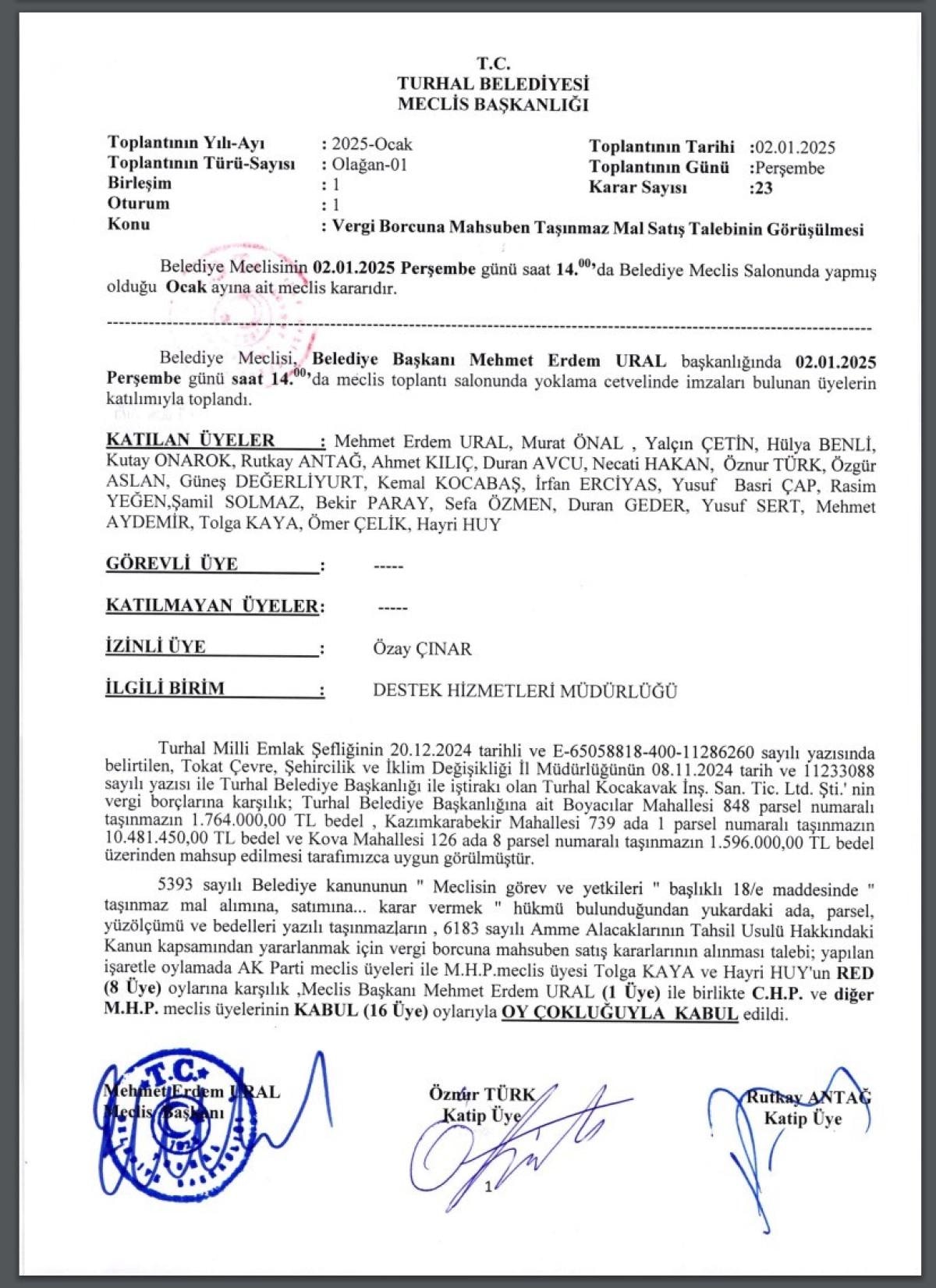Oylamada 6 AK Parti meclis üyesi ile 2 MHP meclis üyesi ret oyu kullanırken, Turhal Belediye Başkanı Mehmet Erdem Ural başta olmak üzere CHP ve diğer MHP üyelerinin de dahil olduğu toplam 16 üyelik oy çokluğuyla karar onaylandı.