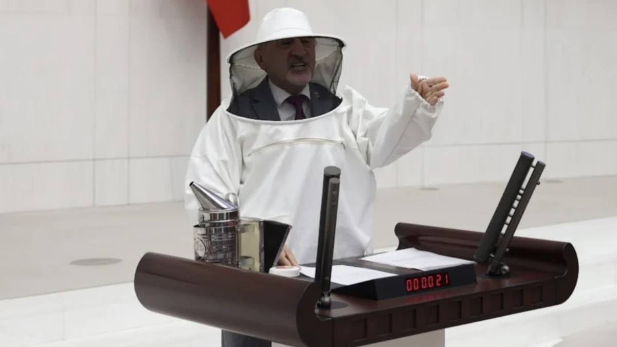 Adıgüzel'in konuşmasının sonunda arıcı kıyafeti giydi.