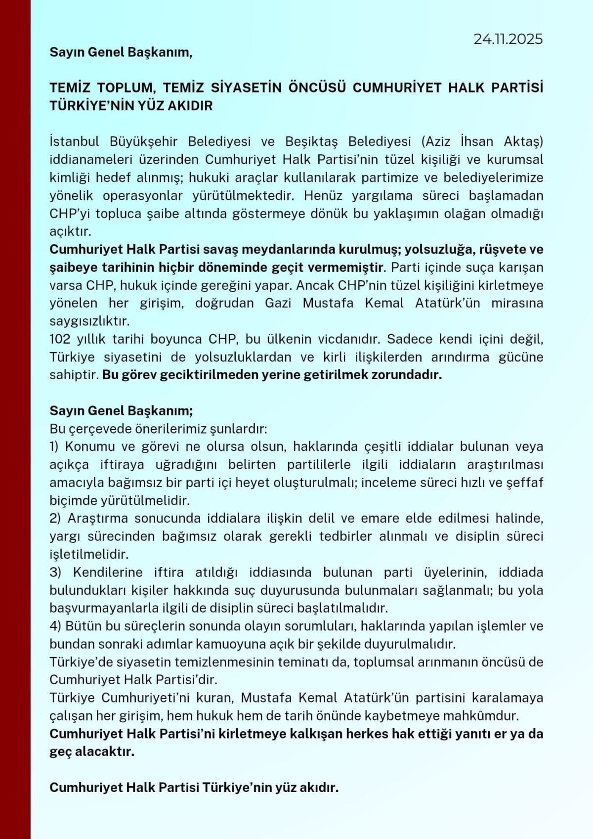 İstanbul Büyükşehir Belediyesi ve Beşiktaş Belediyesi (Aziz İhsan Aktaş) iddianameleri üzerinden Cumhuriyet Halk Partisi'nin tüzel kişiliği ve kurumsal kimliği hedef alınmış; hukuki araçlar kullanılarak partimize ve belediyelerimize yönelik operasyonlar yürütülmektedir.