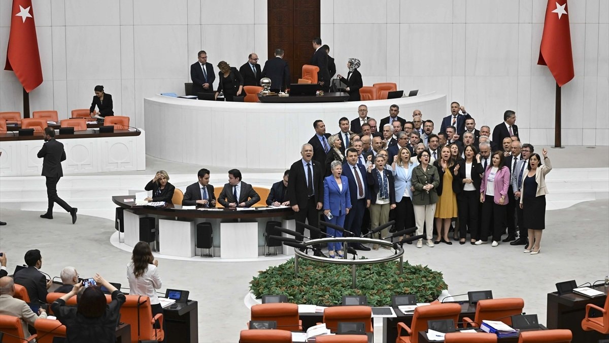 Yeniden birleşim açılınca da CHP milletvekilleri kürsüyü işgal etmeyi sürdürerek slogan attı.