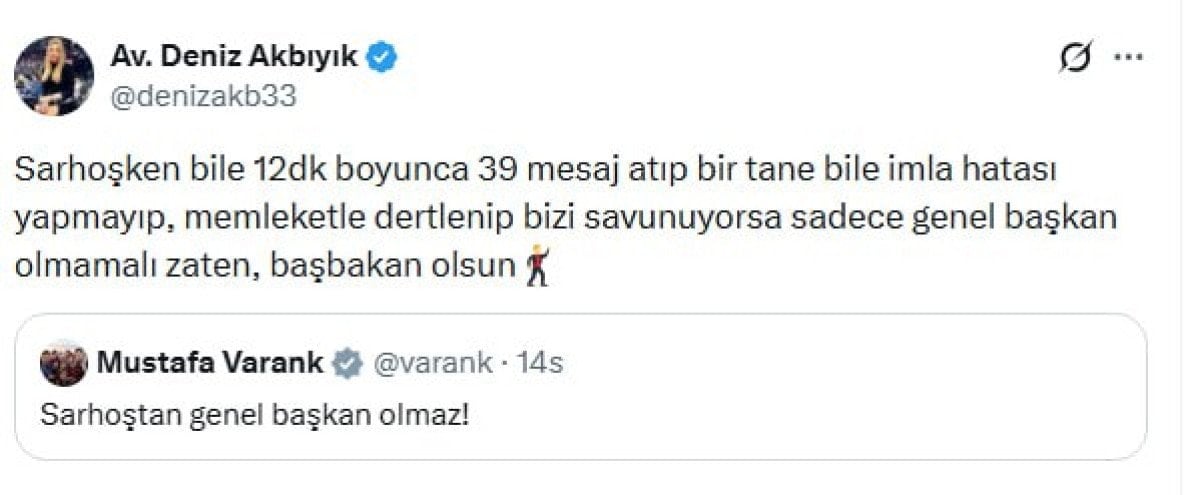 "Sarhoşken bile 12 dk boyunca 39 mesaj atıp bir tane bile imla hatası yapmayıp, memleketle dertlenip bizi savunuyorsa sadece genel başkan olmamalı zaten, başbakan olsun."