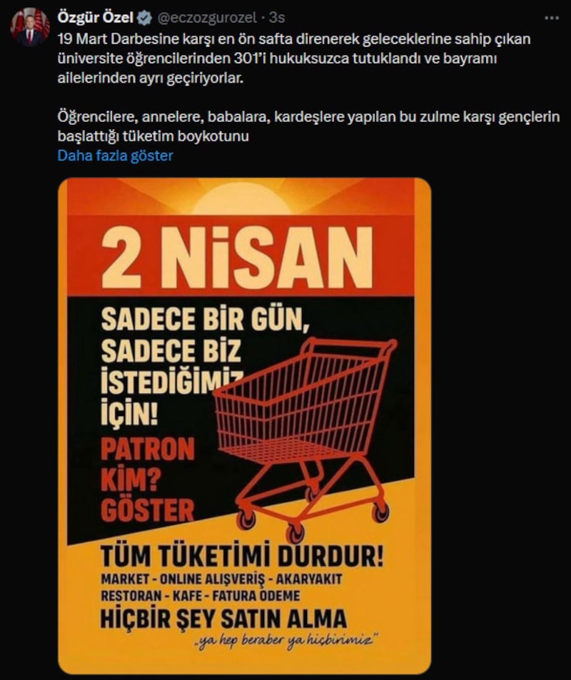 Özel, 2 Nisan 2025 tarihinde tüm tüketim faaliyetlerinin durdurulmasını hedefleyen geniş çaplı bir tüketim boykotu düzenlenmesi çağrısı yaptı.