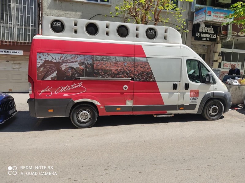 CHP Osmangazi İlçe Başkanlığı'nın seçim minibüsünde MHP'nin miting fotoğraflarının kullanıldığı görüldü.
