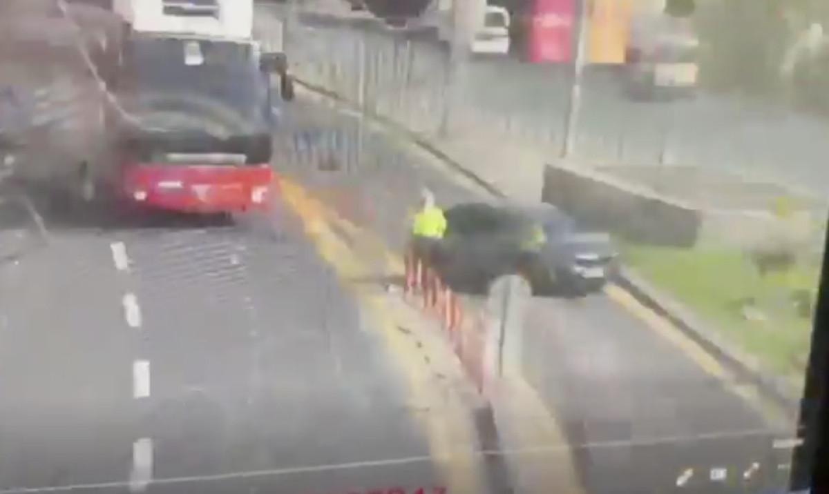 Tepki çeken olayda, trafik polisi, olaydan otobüsün sağına kaçarak yara almadan kurtulurken başlatılan soruşturma kapsamında şoför gözaltına alındı.