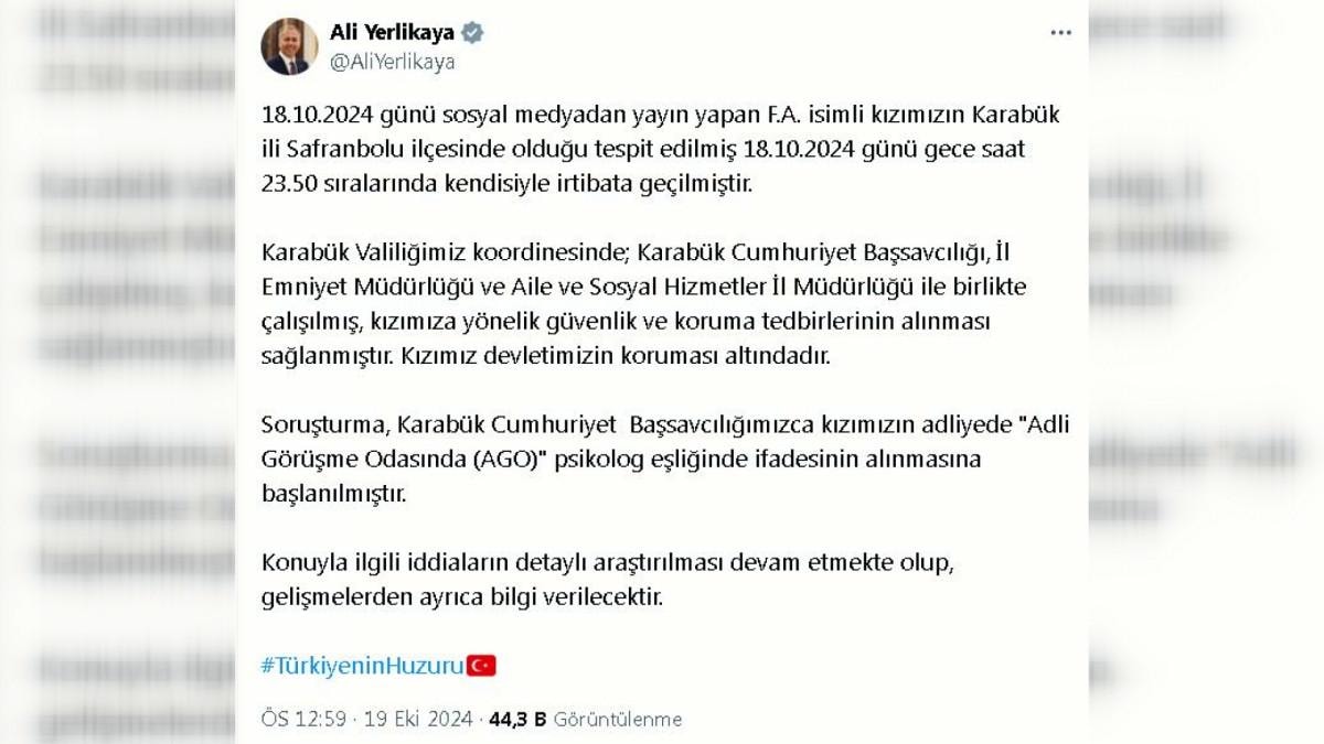İçişleri Bakanı Ali Yerlikaya, konuya ilişkin sosyal medya hesabından yaptığı açıklamada, F.A.'ya ulaşılarak, koruma altına alındığını duyurdu. Yerlikaya, "18 Ekim 2024 günü sosyal medyadan yayın yapan F.A. isimli kızımızın, Karabük ili Safranbolu ilçesinde olduğu tespit edilmiş, gece saat 23.50 sıralarında kendisiyle irtibata geçilmiştir. Karabük Valiliğimiz koordinesinde; Karabük Cumhuriyet Başsavcılığı, İl Emniyet Müdürlüğü ve Aile ve Sosyal Hizmetler İl Müdürlüğü ile birlikte çalışılmış, kızımıza yönelik güvenlik ve koruma tedbirlerinin alınması sağlanmıştır. Kızımız devletimizin koruması altındadır. Karabük Cumhuriyet Başsavcılığımızca kızımızın adliyede adli görüşme odasında psikolog eşliğinde ifadesinin alınmasına başlanılmıştır. Konuyla ilgili iddiaların detaylı araştırılması devam etmekte olup, gelişmelerden ayrıca bilgi verilecektir" dedi.