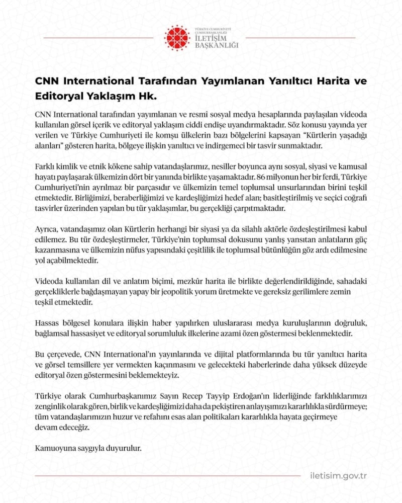 "CNN International tarafından yayımlanan sözde harita ve editoryal yaklaşım, Türkiye’ye ve bölgenin toplumsal gerçekliğine ilişkin yanıltıcı bir çerçeve sunmaktadır. Bu tür tasvirler, bölgedeki toplumsal çeşitliliği ve birlikte yaşama kültürünü göz ardı etmekte; kamuoyunun yanlış yönlendirilmesine yol açabilecek nitelik taşımaktadır."