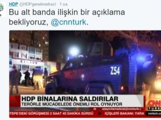 CNN Türk operatörleri, "HDP binalarına saldırılar" haberinin alt bandına "terörle mücadelede önemli rol oynuyor" yazınca HDP Twitter üzerinden hesap sordu: