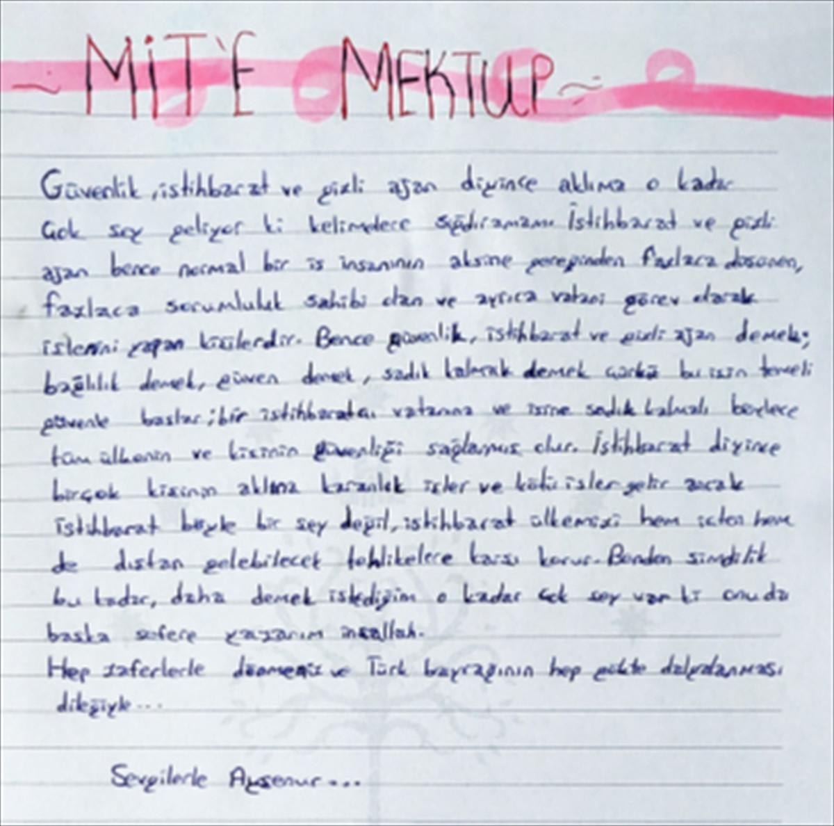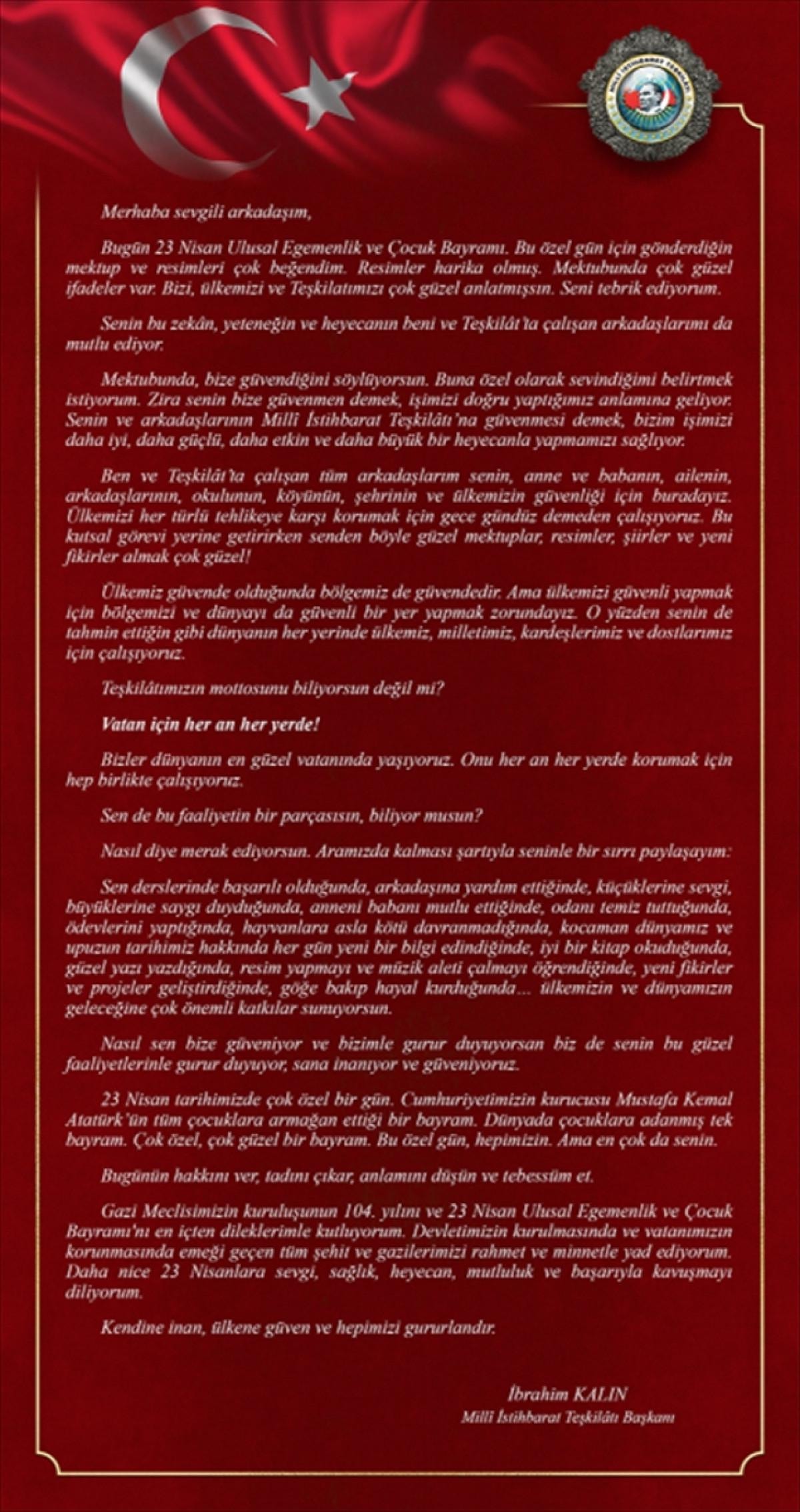 Bizi, ülkemizi ve teşkilatımızı çok güzel anlatmışsın. Seni tebrik ediyorum. Senin bu zekan, yeteneğin ve heyecanın beni ve teşkilatta çalışan arkadaşlarımı da mutlu ediyor. Mektubunda, bize güvendiğini söylüyorsun buna özel olarak sevindiğimi belirtmek istiyorum. Zira senin bize güvenmen demek işimizi doğru yaptığımız anlamına geliyor. Senin ve arkadaşlarının Milli İstihbarat Teşkilatına güvenmesi demek bizim işimize daha iyi, daha güçlü, daha etkin ve daha büyük bir heyecanla yapmamızı sağlıyor.