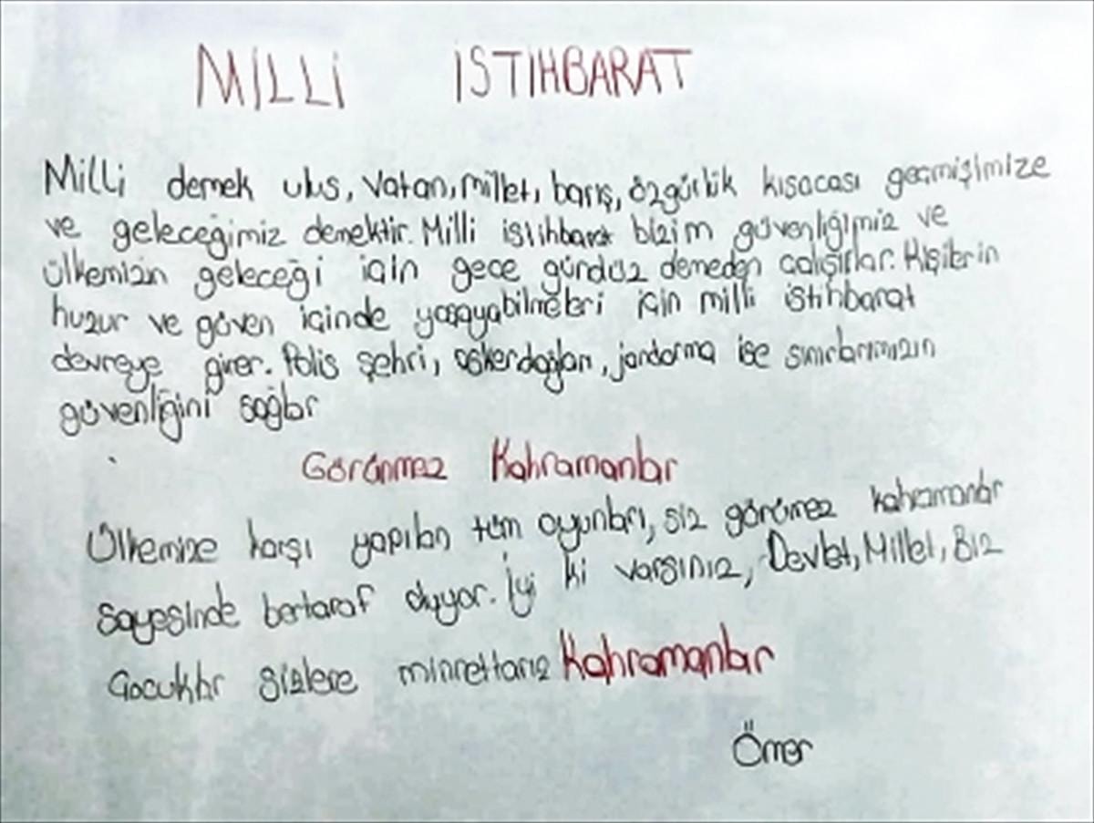 Her hafta Teşkilat dizisini izliyorum. Ve oradaki abilerin bizler için neler yaptıklarını görüyorum. Ama her pazar babam ile kavga ediyoruz. Dizinin sonunu izleyemiyorum. Lütfen babama söyleyin, dizinin tamamını izlemem için izin versin. Her akşam yatmadan önce dua ediyoruz, etmezsek kabus görüyorum. 'Allahım, vatanımızı savunan güvenlik güçlerimize güç, kudret ver. Amin!'