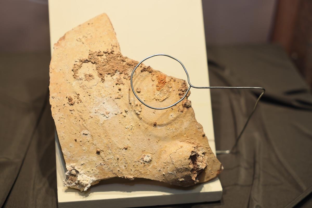 Yaklaşık 24x20 santim boyutlarındaki bir çömlek parçası üzerine yapışan 3x3 santim büyüklüğündeki kumaş parçası, ilk kez görücüye çıktı.
