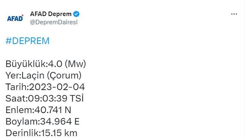 Afet ve Acil Durum Yönetimi Başkanlığının internet sitesinde yer alan bilgiye göre, Çorum'un Laçin ilçesinde saat 09.03'te 4 büyüklüğünde deprem kaydedildi.