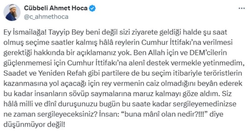 Cübbeli Ahmet Hoca, "Ey İsmailağa! Tayyip Bey beni değil sizi ziyarete geldiği halde şu saat olmuş seçime saatler kalmış hâlâ reylerin Cumhur İttifakı’na verilmesi gerektiği hakkında bir açıklamanız yok" dedi.