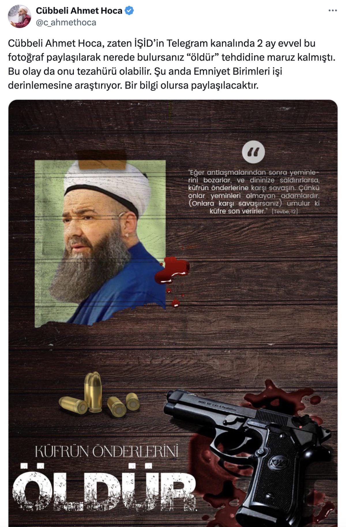 Cübbeli Ahmet Hoca, zaten İŞİD’in Telegram kanalında 2 ay evvel bu fotoğraf paylaşılarak nerede bulursanız “öldür” tehdidine maruz kalmıştı. Bu olay da onu tezahürü olabilir. Şu anda Emniyet Birimleri işi derinlemesine araştırıyor. Bir bilgi olursa paylaşılacaktır.