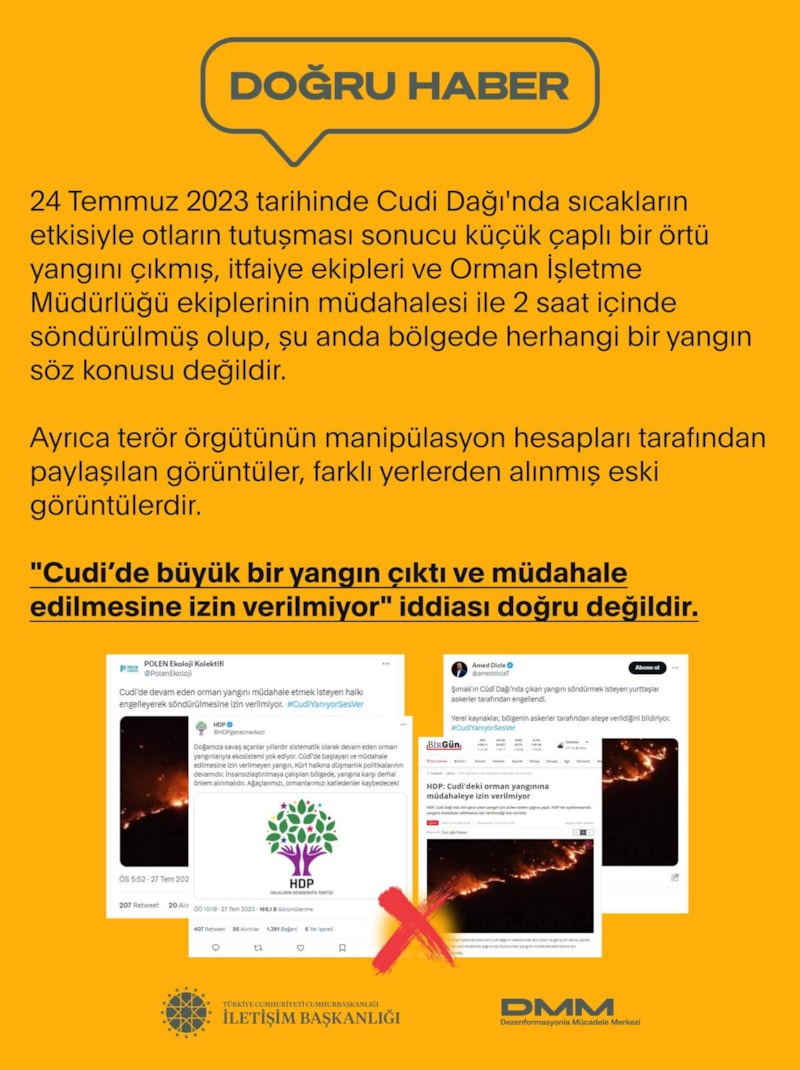 İletişim Başkanlığı'na bağlı Dezenformasyonla Mücadele Merkezi, HDP'nin Cudi Dağı'nda çıkan ufak çaplı yangına müdahale edilmediği iddiasını yaptığı paylaşımla çürüttü.