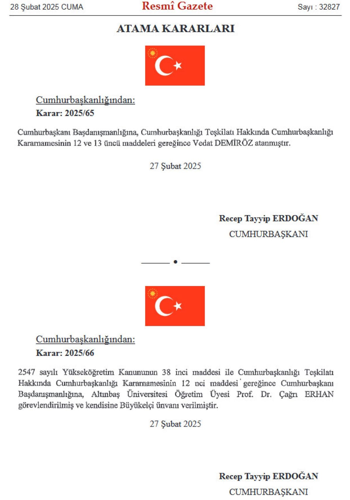 Resmi Gazete'nin 28 Şubat 2025 tarihli sayısına göre, Vedat Demiröz, Cumhurbaşkanı Başdanışmanlığına atandı.