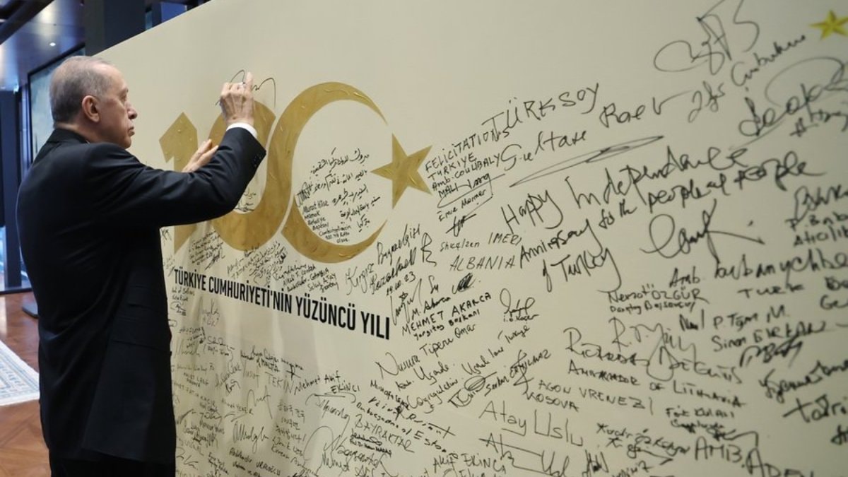 Cumhurbaşkanlığı Külliyesi'nde tebrikleri kabul eden Erdoğan, akabinde de 100. yıl panosunu imzaladı.