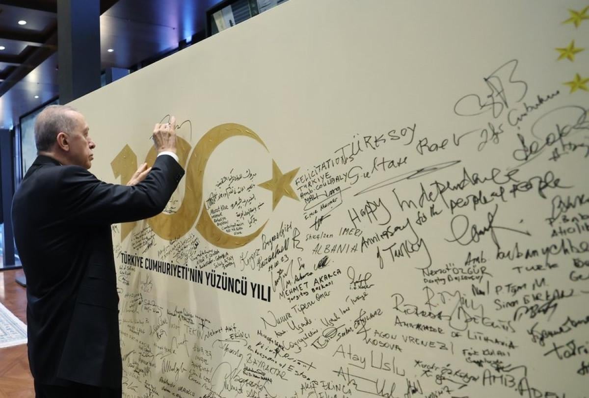Cumhurbaşkanımız Recep Tayyip Erdoğan, Cumhuriyetimizin 100'üncü kuruluş yıl dönümü dolayısıyla hazırlanan panoyu imzaladı.