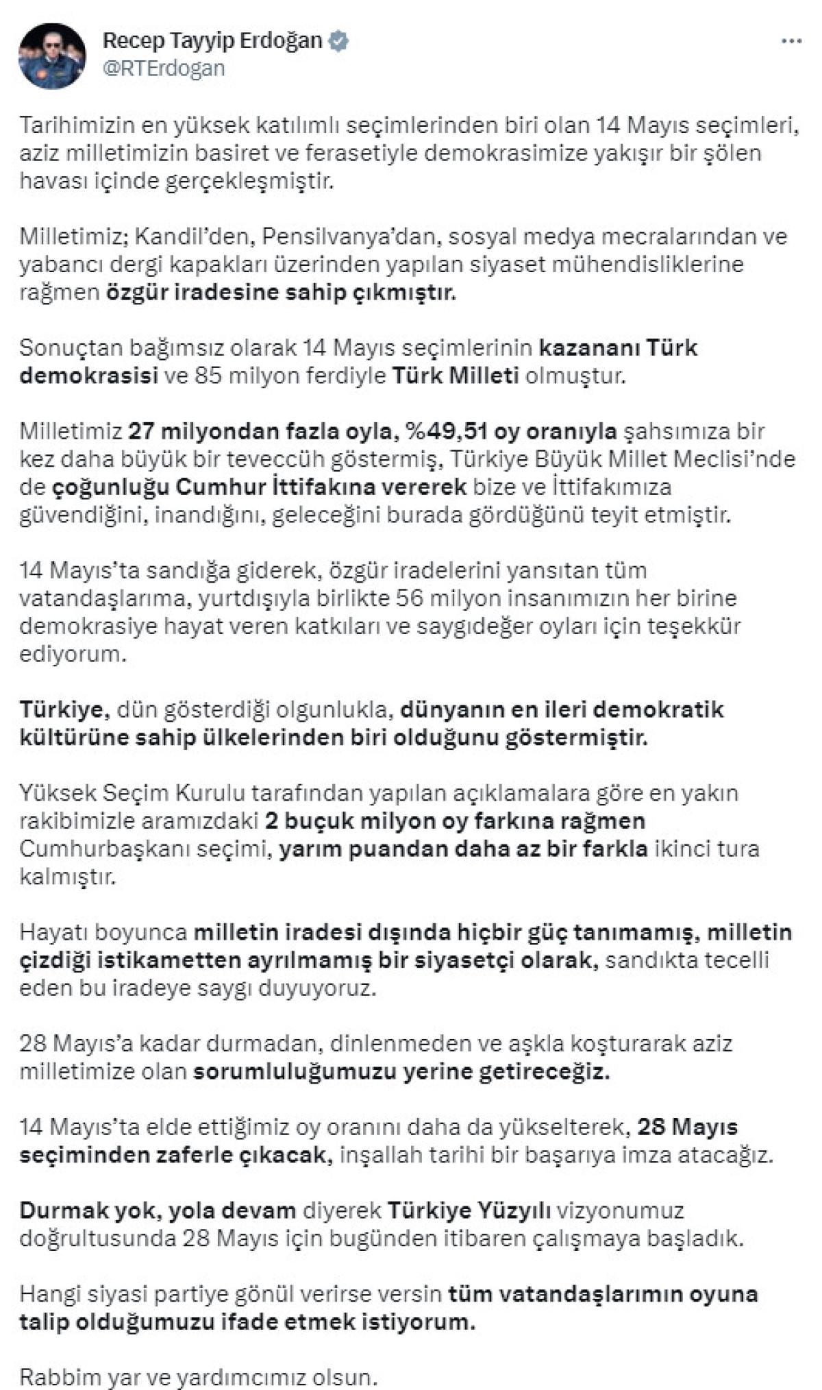 "Tarihimizin en yüksek katılımlı seçimlerinden biri olan 14 Mayıs seçimleri, aziz milletimizin basiret ve ferasetiyle demokrasimize yakışır bir şölen havası içinde gerçekleşmiştir.