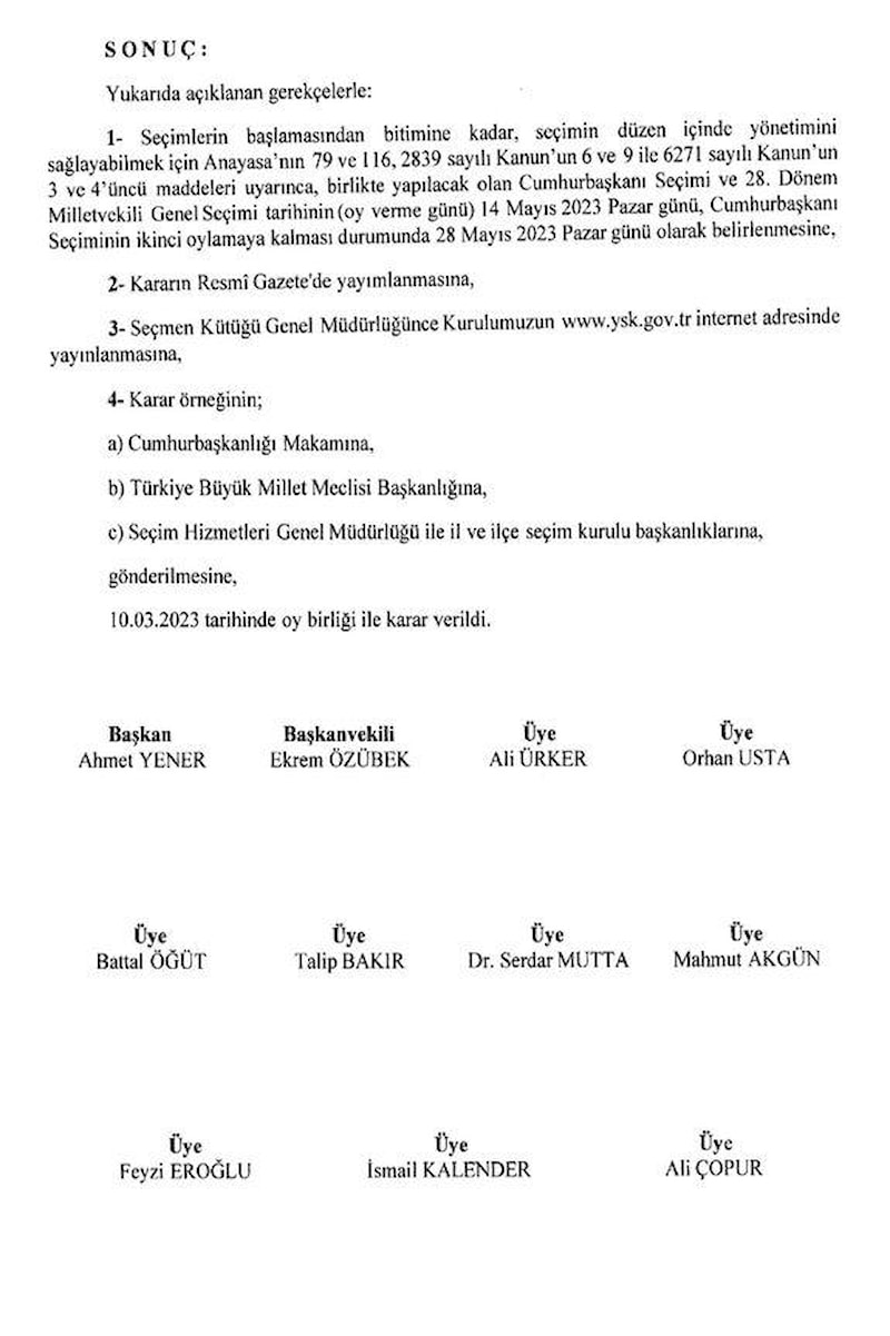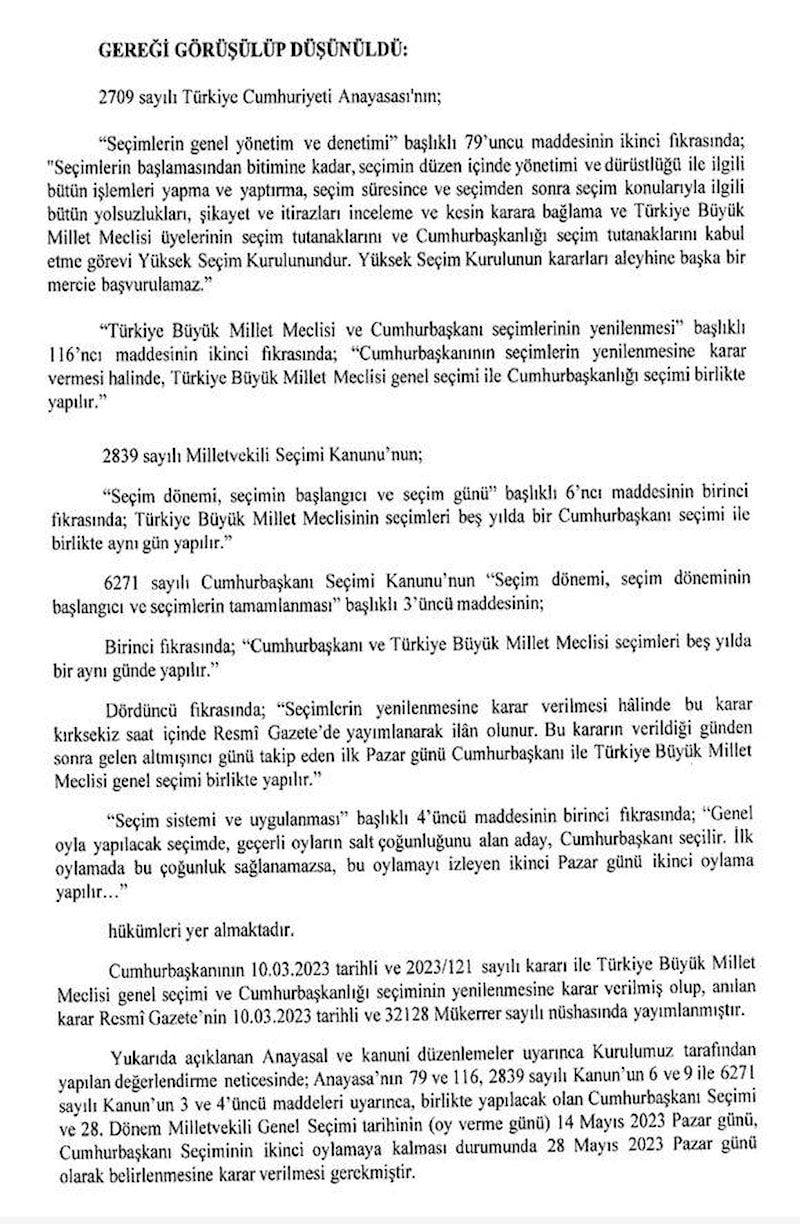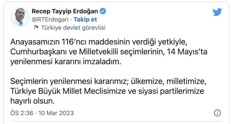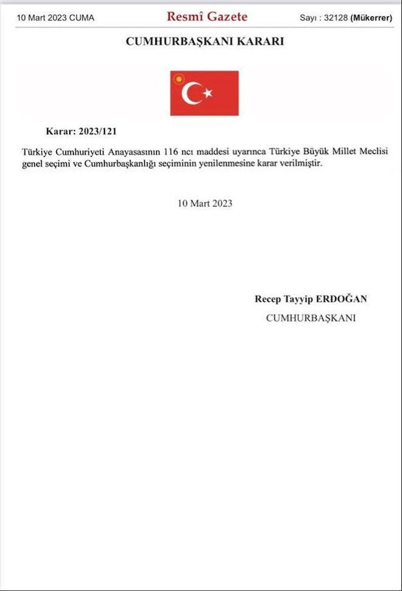 "Biraz önce Anayasamızın 116'ncı maddesinin verdiği yetkiyle 18 Haziran'da yapılması gereken seçimlerin 14 Mayıs'ta yenilenmesi kararını imzalamış bulunuyorum. Yarın Resmi Gazete'de yayınlanacak kararın ardından YTSK seçim takvimini başlatacak.