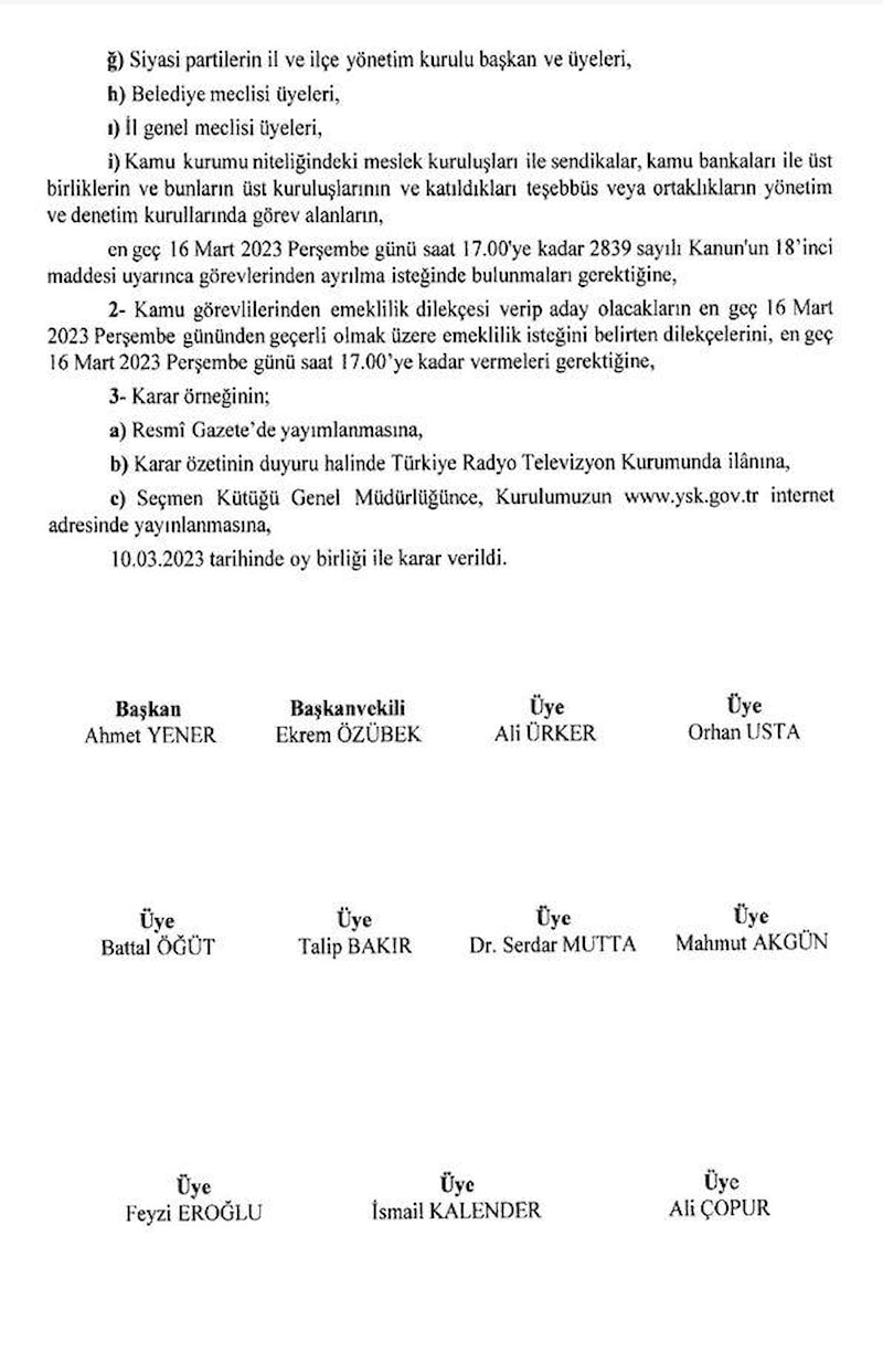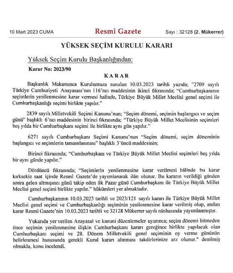 Anayasa'nın bize verdiği yetkiyle seçimleri 14 Mayıs'ta yapma kararını hayata geçiriyoruz. Kararın Resmi Gazete'de yayınlanmasıyla YSK seçim takvimini hazırlayıp ilan edecektir. Bugün mükerrer sayıda yayınlanması da olacaktır.