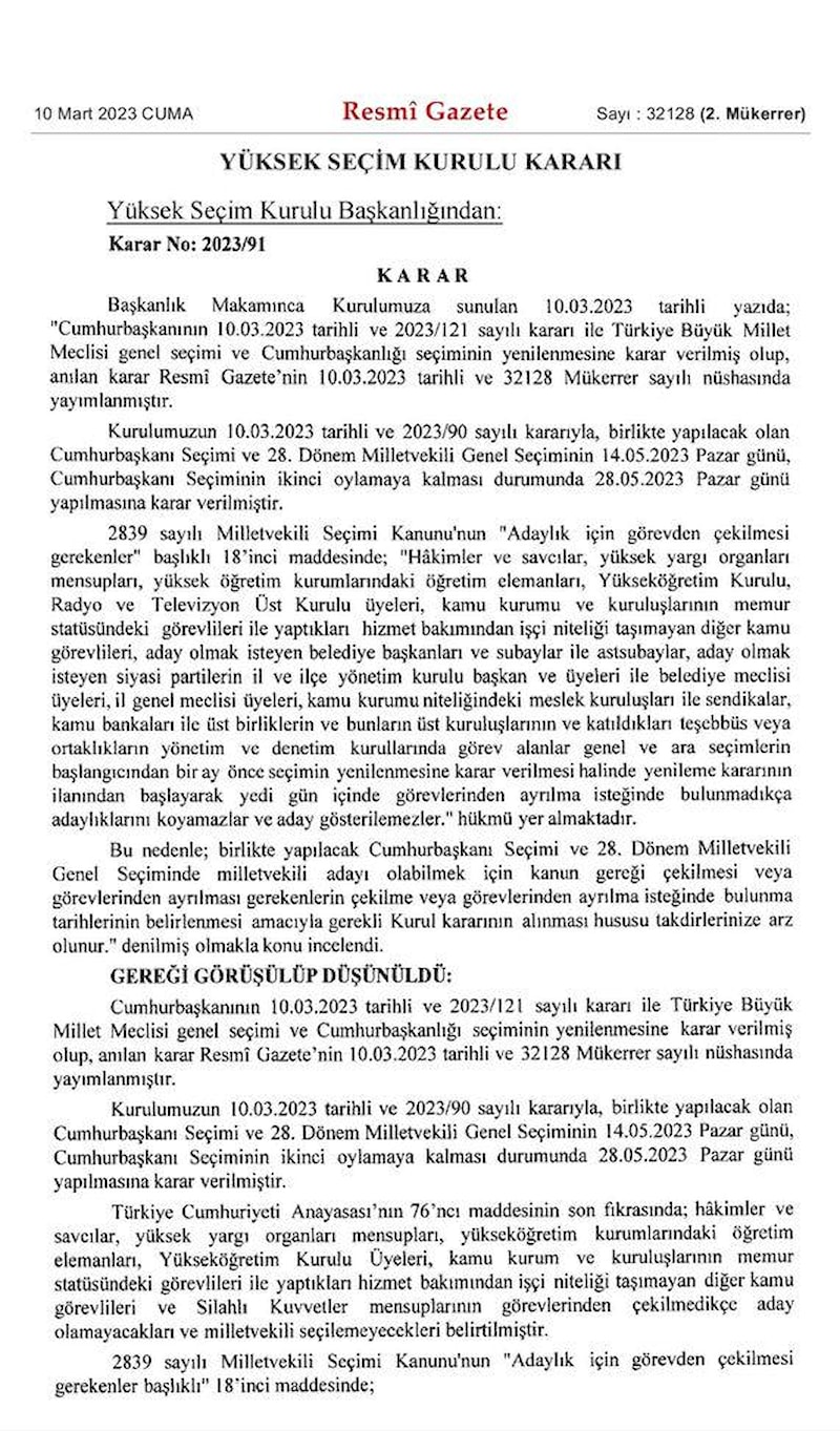 Seçimlerin yenilenmesine dair Cumhurbaşkanı kararı Resmi Gazete’nin bugünkü mükerrer sayısında yayınlandı.