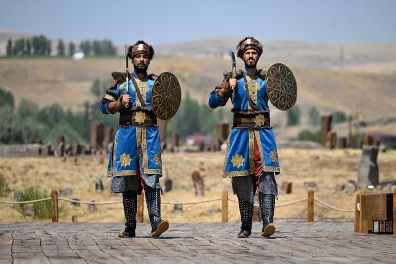 Malazgirt ve Bitlis'in Ahlat ilçelerinde düzenlenen Malazgirt Zaferi'nin 954. yıl dönümü kutlamaları kapsamında Jandarma Genel Komutanlığı birliği giydikleri Selçuklu Alp kıyafetleriyle Selçuklu Meydan Mezarlığı'nda ecdada saygı nöbeti tuttu.