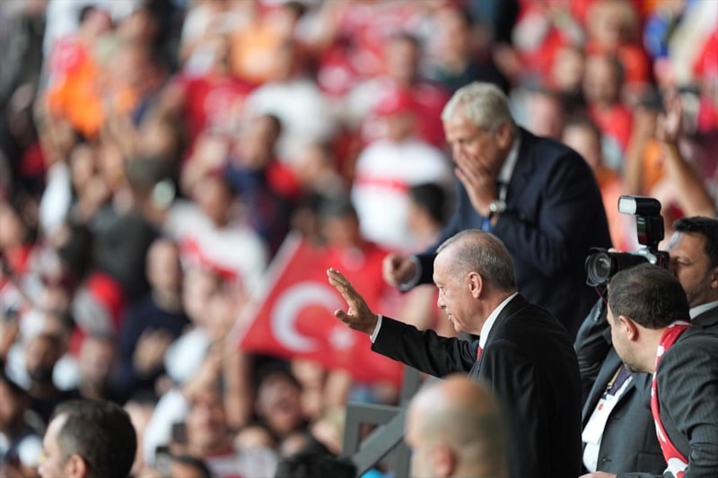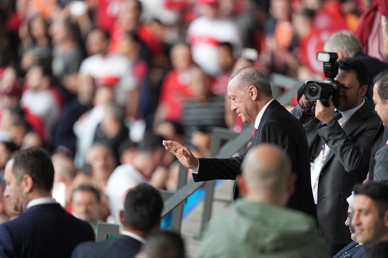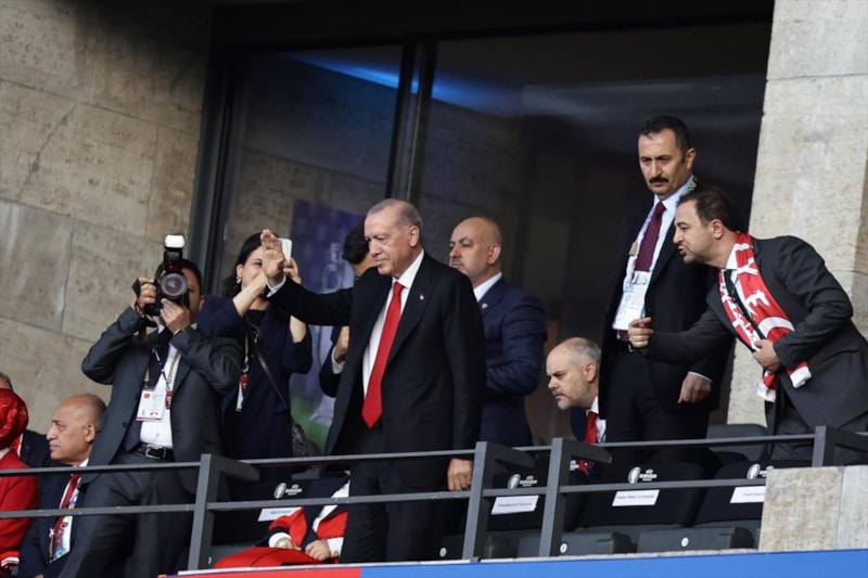 Ardından karşılaşmanın gerçekleşeceği Berlin Olimpiyat Stadyumu'na geçen Cumhurbaşkanı Erdoğan, burada Türk taraftarlarla selamlaşarak tribündeki yerini aldı.