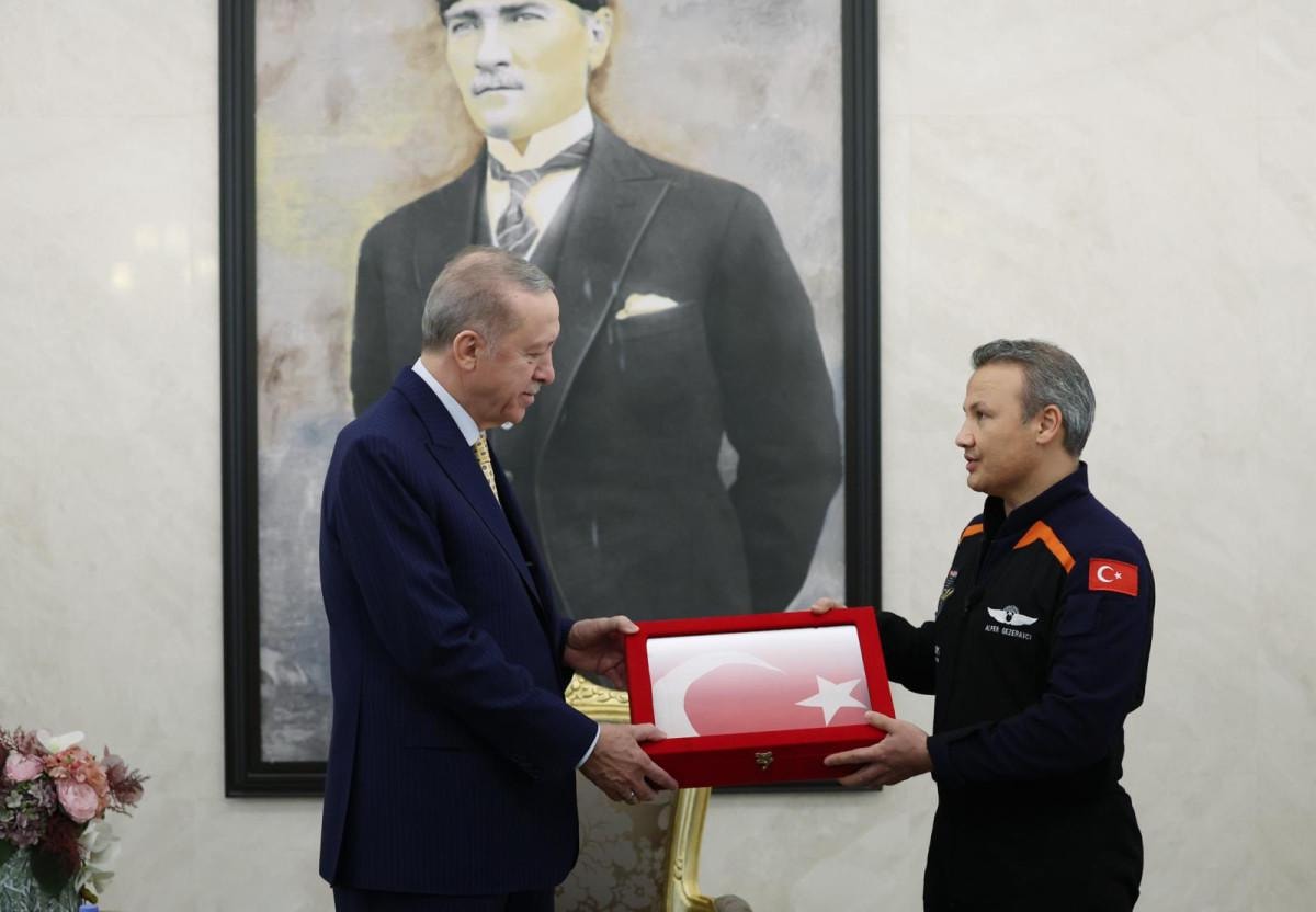 Alper Gezeravcı ve ailesiyle görüşen Cumhurbaşkanı Erdoğan, yine Gezeravcı'nın beraberinde götürüp getirdiği Türk bayrağını teslim aldı.
