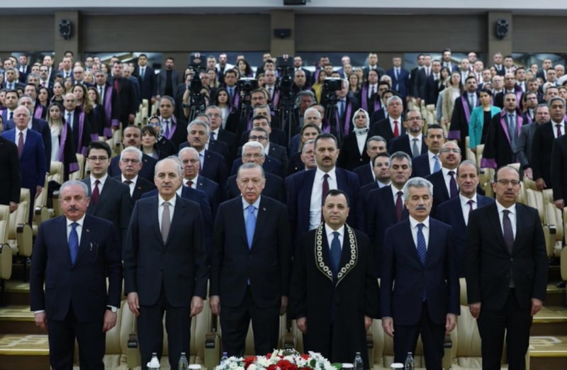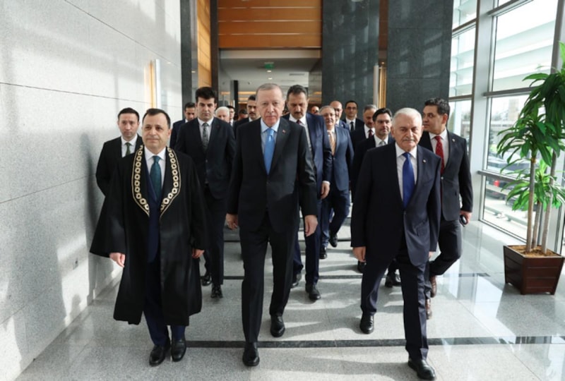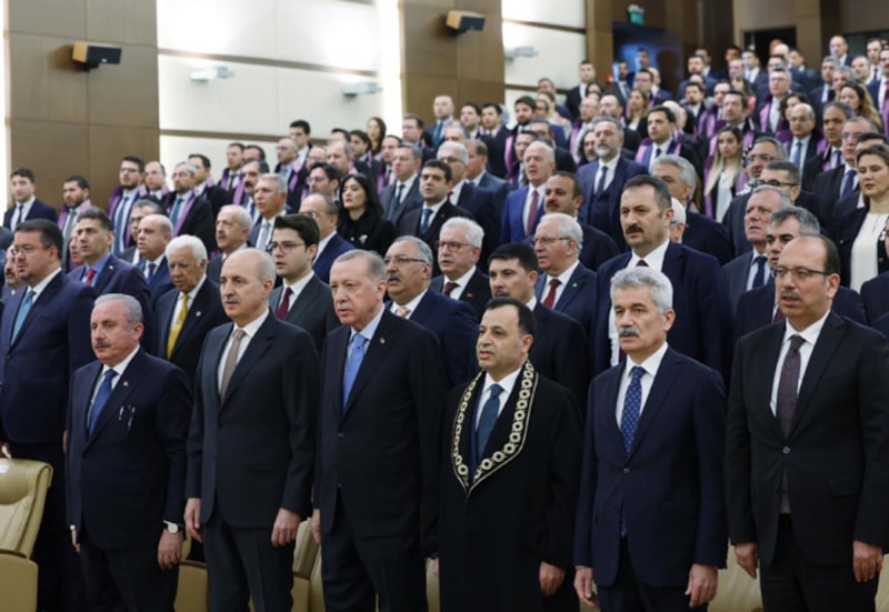 Anayasa Mahkemesi Yüce Divan Salonu’nda gerçekleştirilen törene gelişinde Anayasa Mahkemesi Başkanı Zühtü Arslan tarafından karşılanan Cumhurbaşkanı Erdoğan, daha sonra törenin düzenlendiği salona geçti.