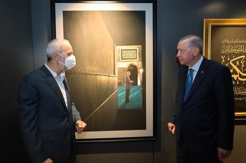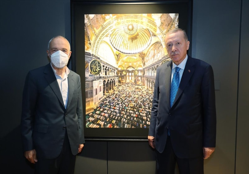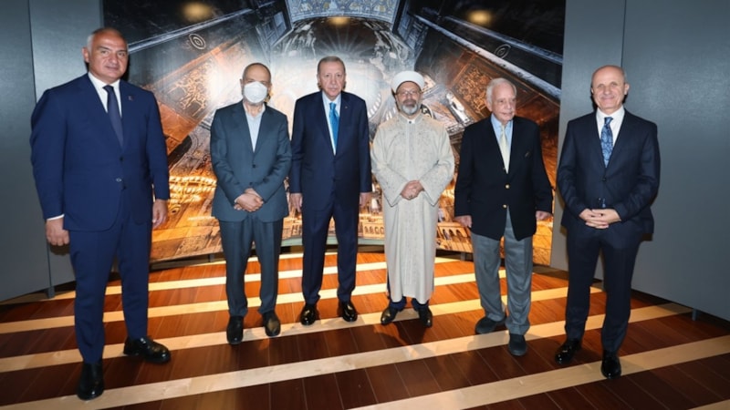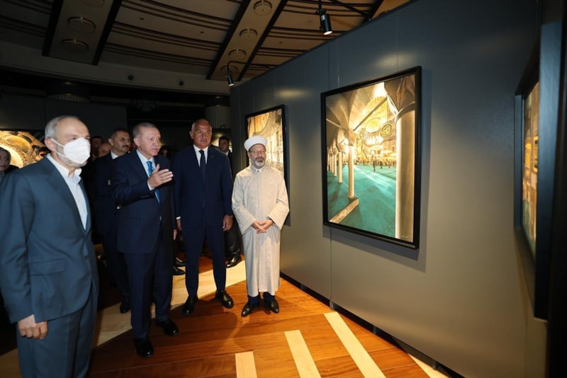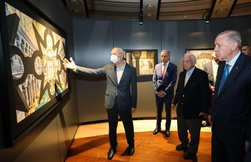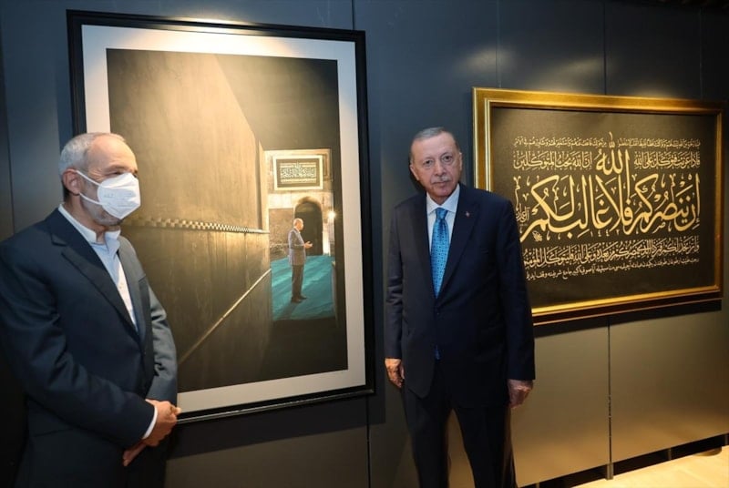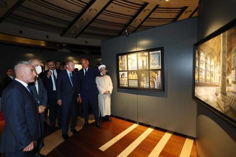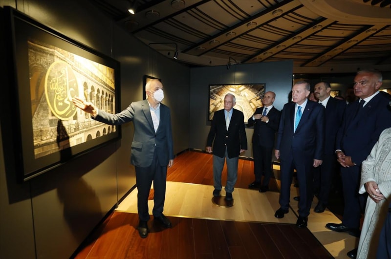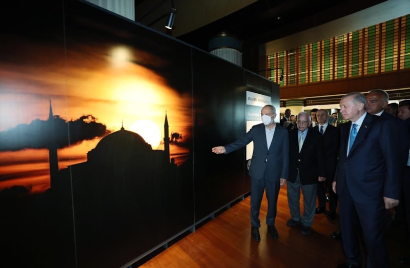 Cumhurbaşkanı Erdoğan, Ayasofya-i Kebir Cami-i Şerifi'nin yeniden ibadete açılmasının ardından fotoğraf sanatçıları İzzet Keribar ve Mehmet Özçay'ın çektiği fotoğraflardan oluşan 'Ayasofya Fotoğrafları' sergisini ziyaret etti.