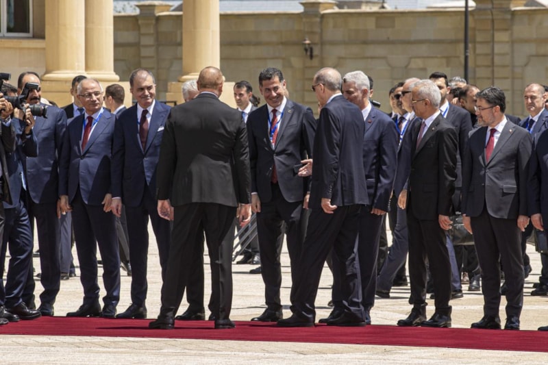 Oğan, önce Aliyev ile tokalaşmasının ardından daha sonra da Erdoğan ile selamlaştı.