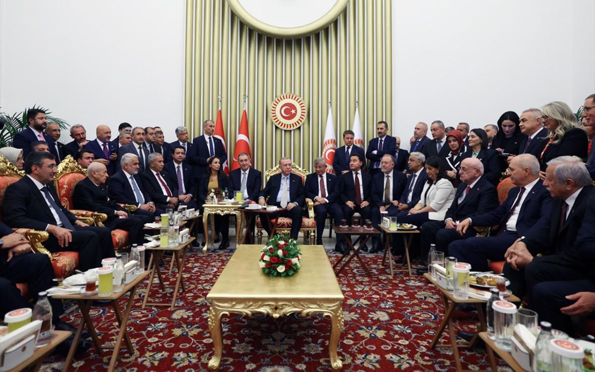 Resepsiyona Cumhurbaşkanı Erdoğan da katılırken MHP Genel Başkanı Devlet Bahçeli, DEM Parti Eş Genel Başkanları Tuncer Bakırhan ve Tülay Hatimoğulları Oruç, DEVA Partisi Genel Başkanı Ali Babacan, Gelecek Partisi Genel Başkanı Ahmet Davutoğlu, Büyük Birlik Partisi Genel Başkanı Mustafa Destici, HÜDA PAR Genel Başkanı Zekeriya Yapıcıoğlu ve milletvekilleri ile sohbet etti.
