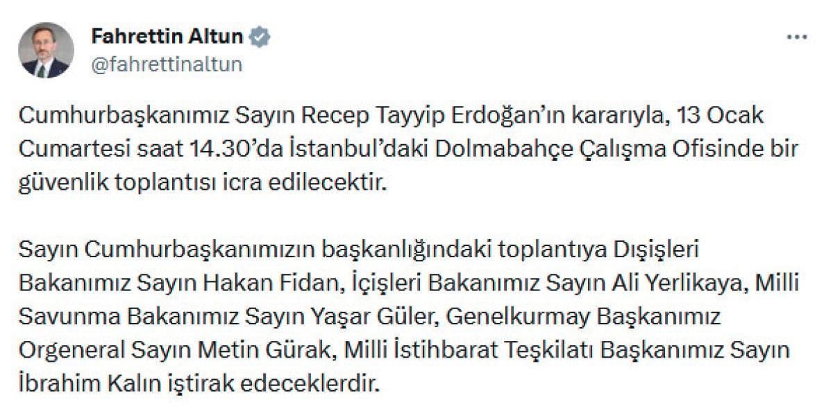 "Cumhurbaşkanımız Sayın Recep Tayyip Erdoğan'ın kararıyla, 13 Ocak Cumartesi saat 14.30'da İstanbul'daki Dolmabahçe Çalışma Ofisinde bir güvenlik toplantısı icra edilecektir. Sayın Cumhurbaşkanımızın başkanlığındaki toplantıya Dışişleri Bakanımız Sayın Hakan Fidan, İçişleri Bakanımız Sayın Ali Yerlikaya, Milli Savunma Bakanımız Sayın Yaşar Güler, Genelkurmay Başkanımız Orgeneral Sayın Metin Gürak, Milli İstihbarat Teşkilatı Başkanımız Sayın İbrahim Kalın iştirak edeceklerdir."